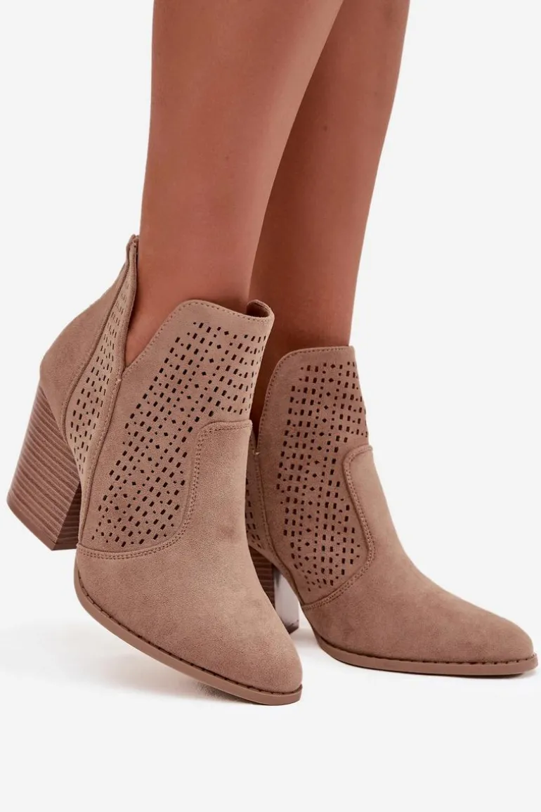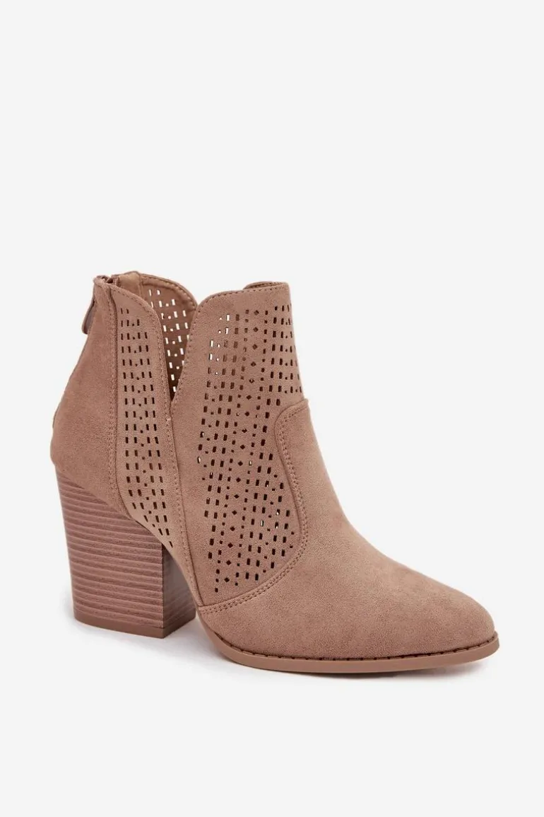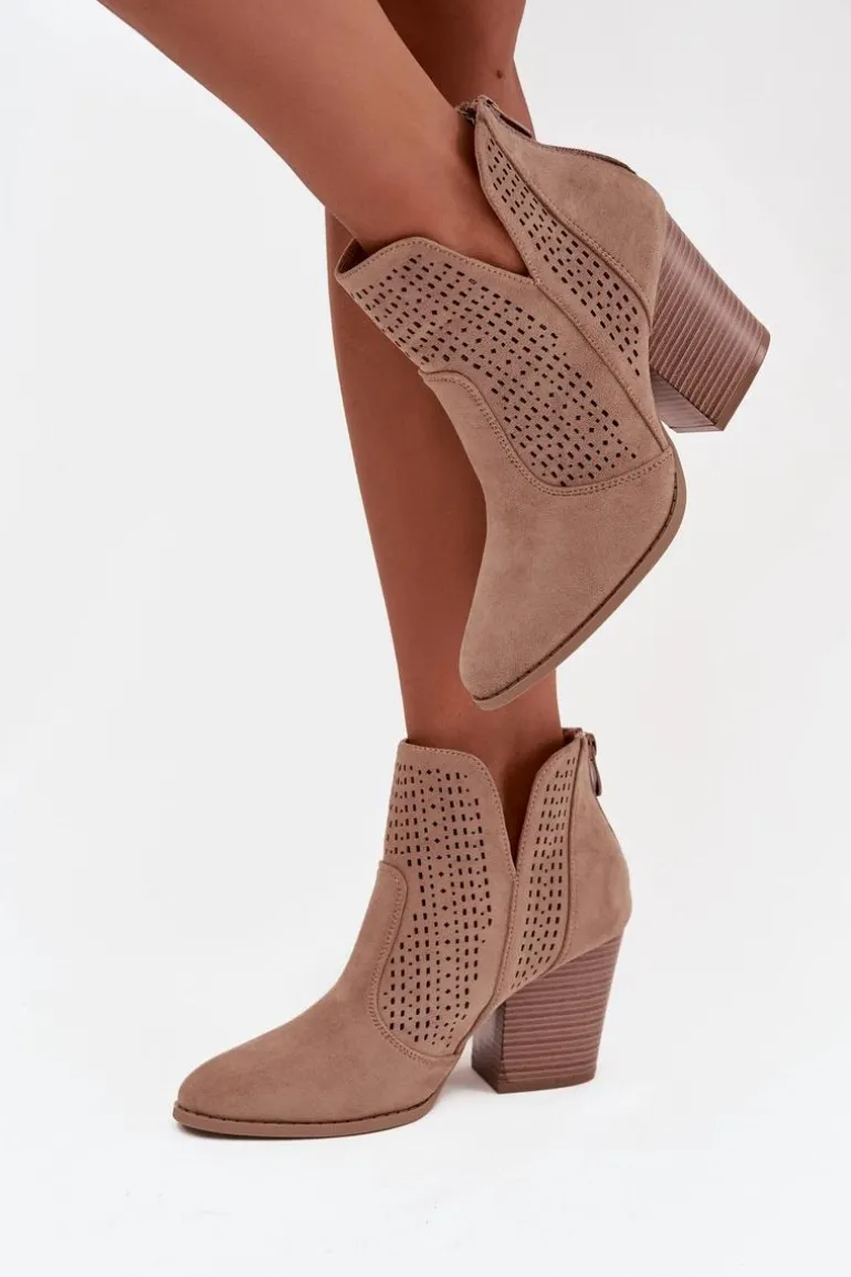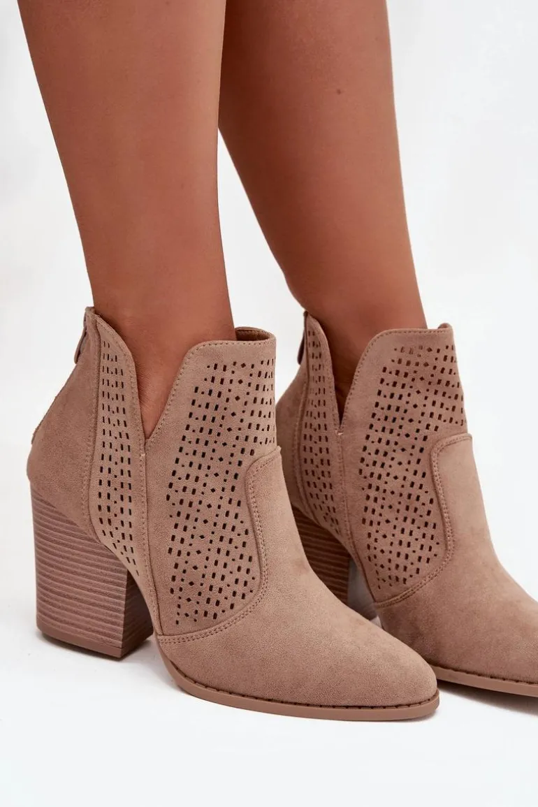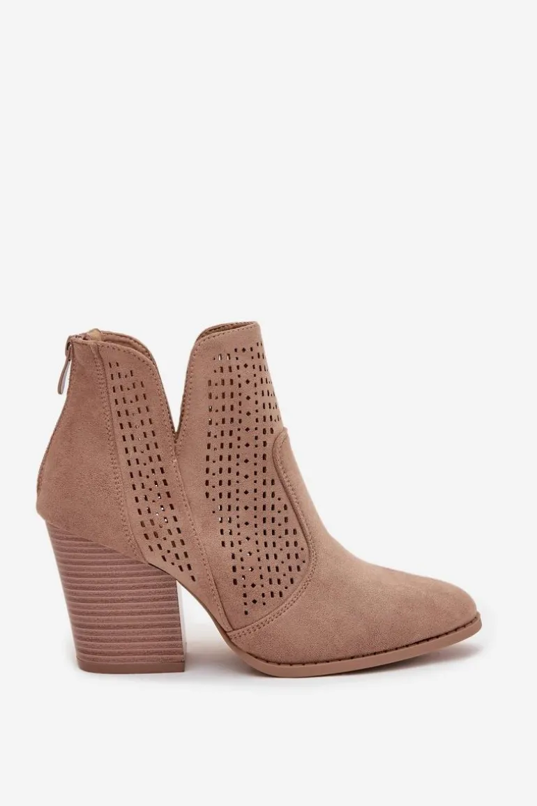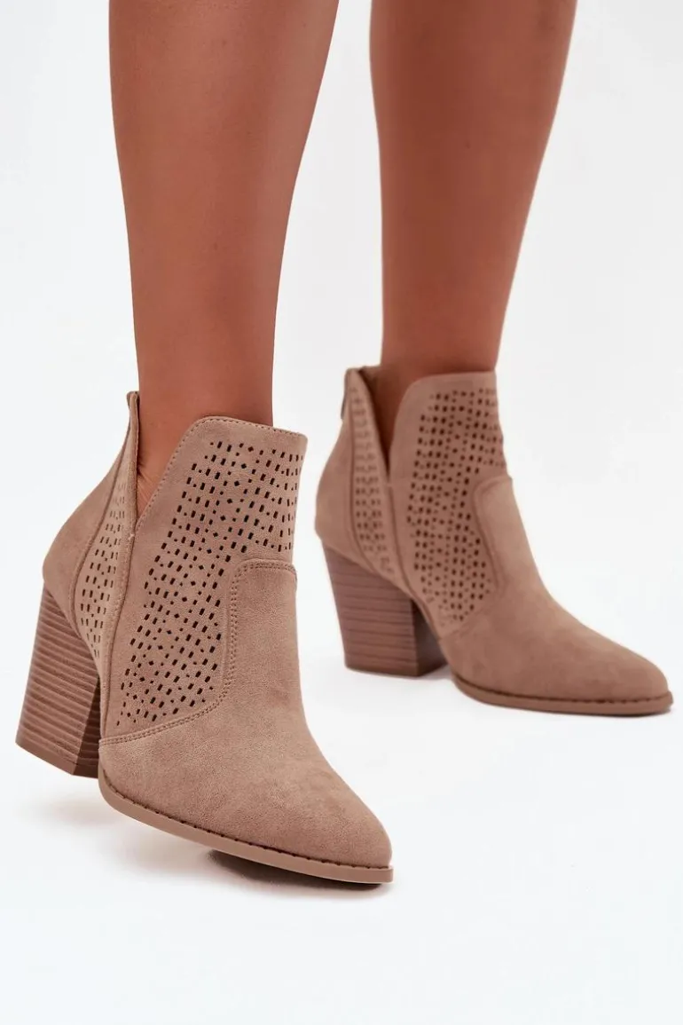 Botki damskie marki S. Barski wykonane z eko zamszu. Osadzone na stabilnym obcasie typu słupek, subtelnie wysmuklają sylwetkę. Model wyróżnia się modnymi wycięciami oraz ażurowym wzorem na cholewce, które nadają całości oryginalnego charakteru. Zamek umieszczony z tyłu ułatwia zakładanie i zdejmowanie butów. To botki, które świetnie sprawdzą się zarówno w casualowych, jak i bardziej eleganckich stylizacjach.