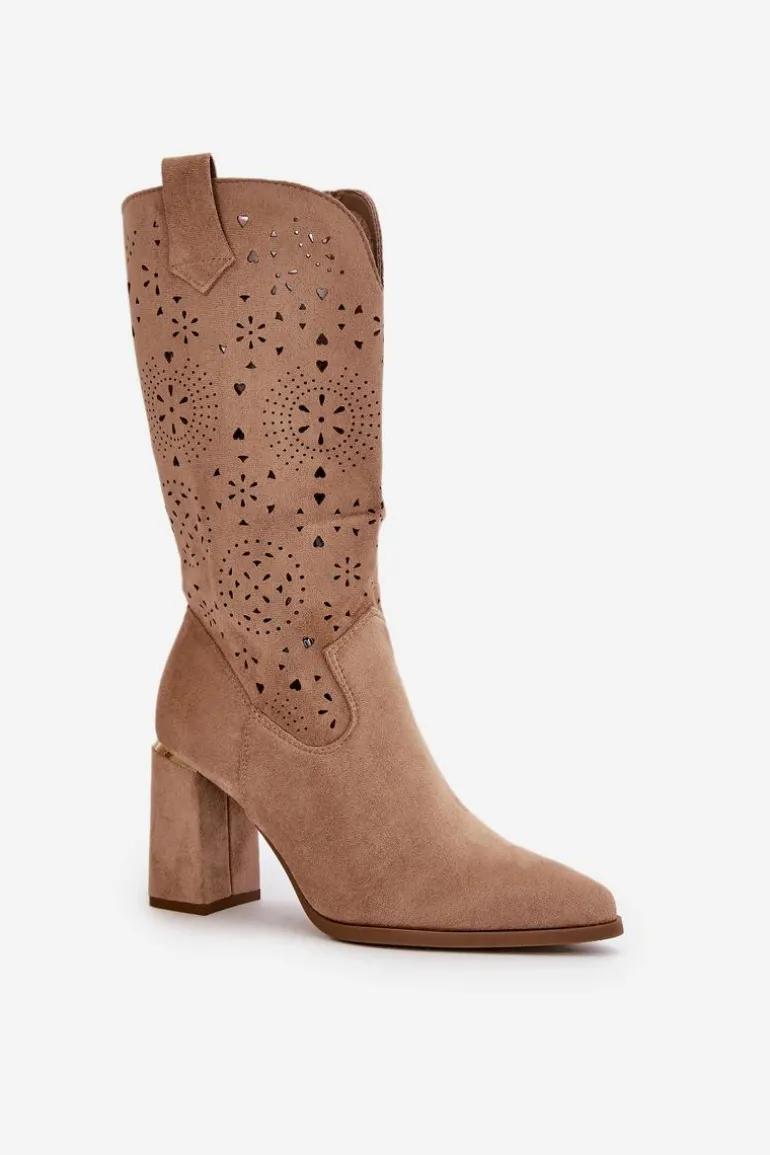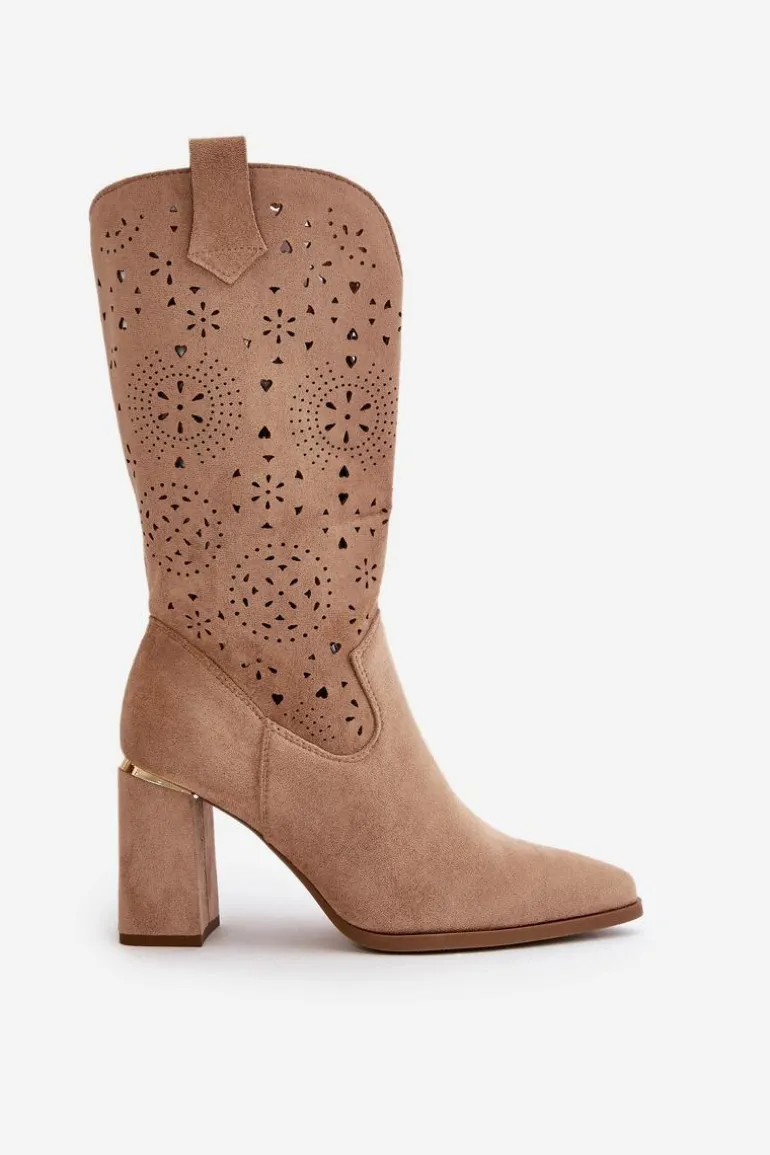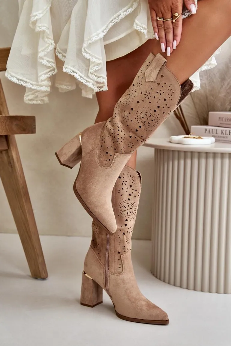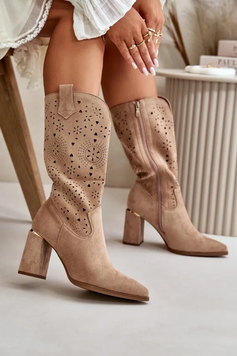 Damskie botki z przyjemnego w dotyku eko zamszu. Posiadają ażurową cholewkę sięgającą do połowy łydki. Osadzone na słupkowym obcasie z lustrzanym akcentem. Zapinane na zamek, z noskami w szpic. Ten modny i elegancki fason będzie idealnym dopełnieniem wielu stylizacji! Przy wyborze rozmiaru prosimy sugerować się tabelą rozmiarów.