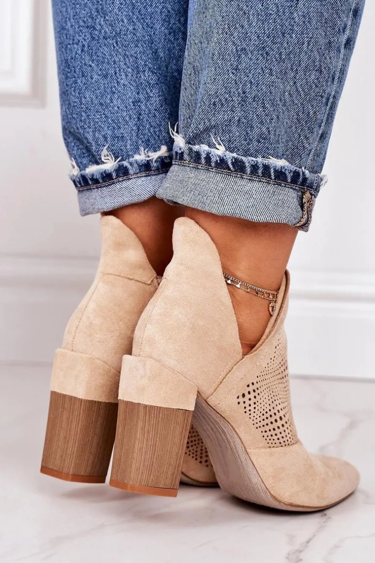 Wiosenne ażurowe botki na słupku. Buty wykonane są z eko zamszu. Botki są bardzo wygodne dzięki miękkiej wkładce oraz stabilnemu słupkowi. Koniecznie sprawdź całą naszą kolekcję damskich botków! Przy wyborze rozmiaru prosimy sugerować się tabelą rozmiarów.