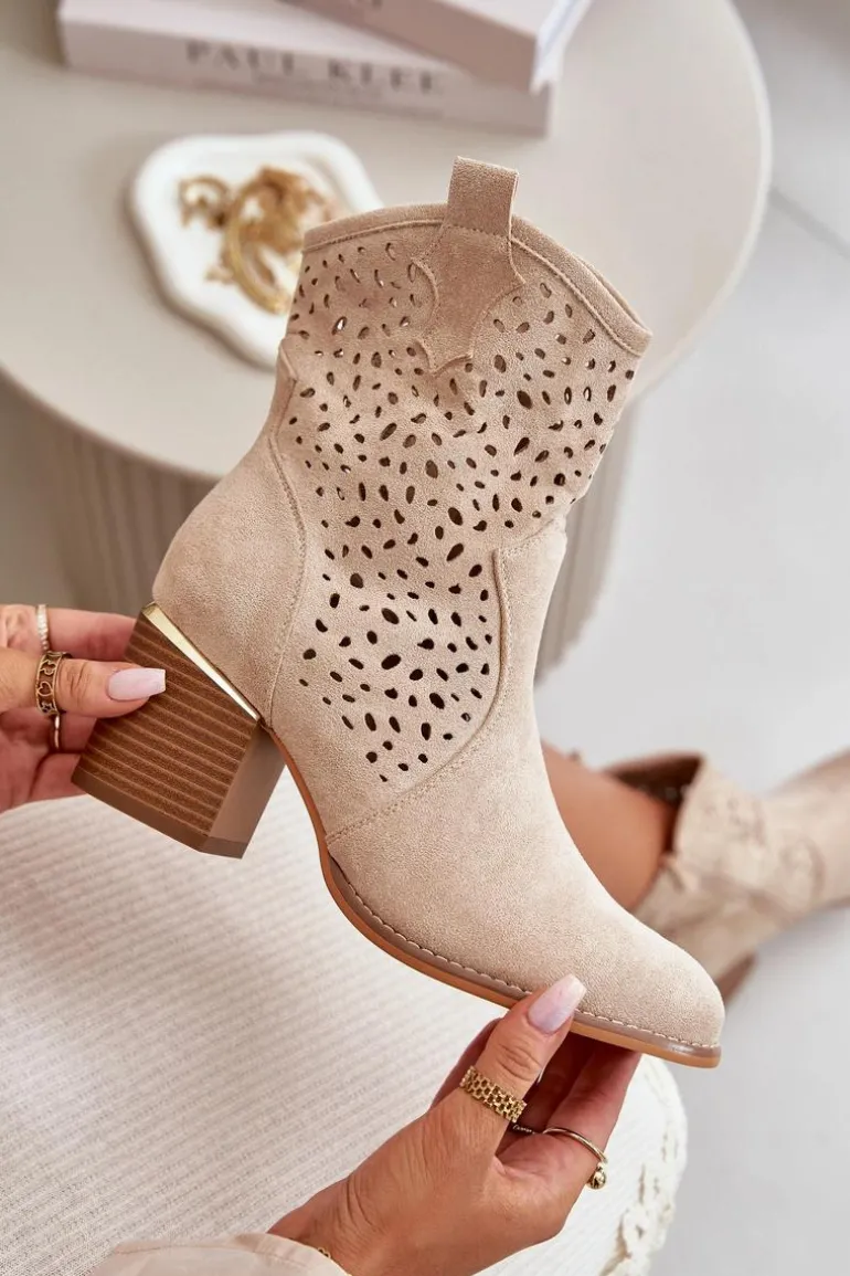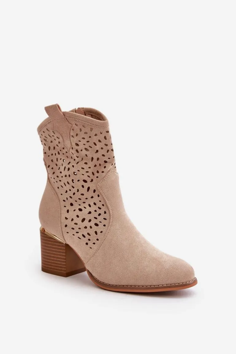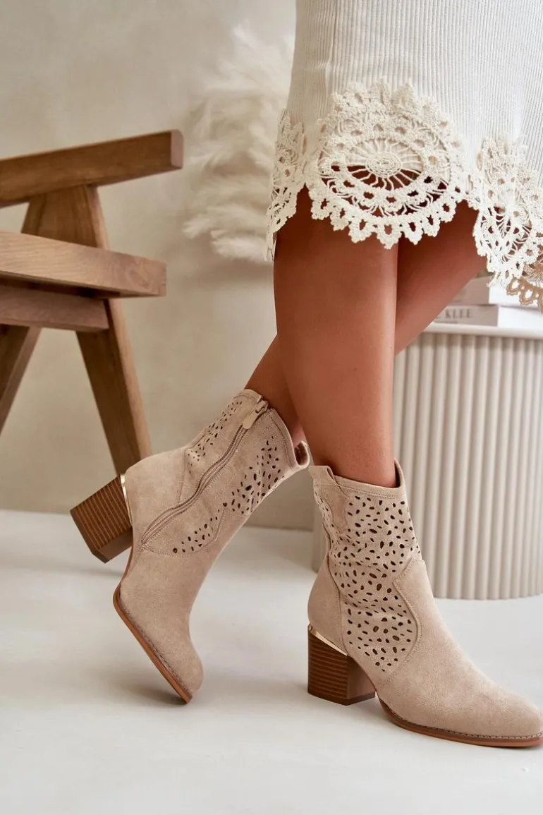 Damskie botki wykonane z eko zamszu, wyróżniają się ażurową cholewką, która sięga za kostkę. Osadzone na eleganckim słupkowym obcasie, ozdobionym złotym elementem, co dodaje im wyjątkowego charakteru. Zapinane na zamek, zapewniają wygodę użytkowania. Noski zaokrąglone, co podkreśla ich klasyczny i stylowy wygląd. Idealne do codziennych i eleganckich stylizacji. Przy wyborze rozmiaru prosimy sugerować się tabelą rozmiarów.