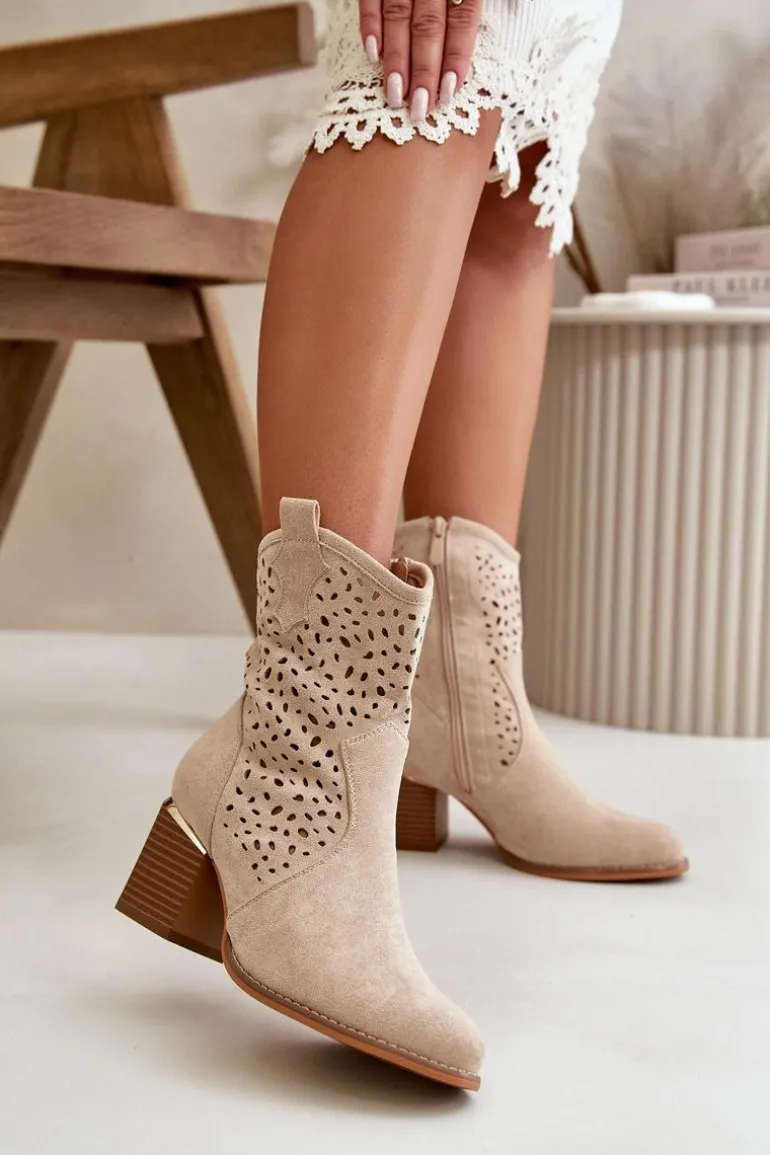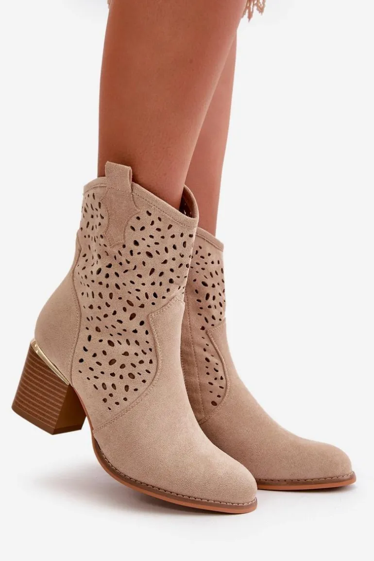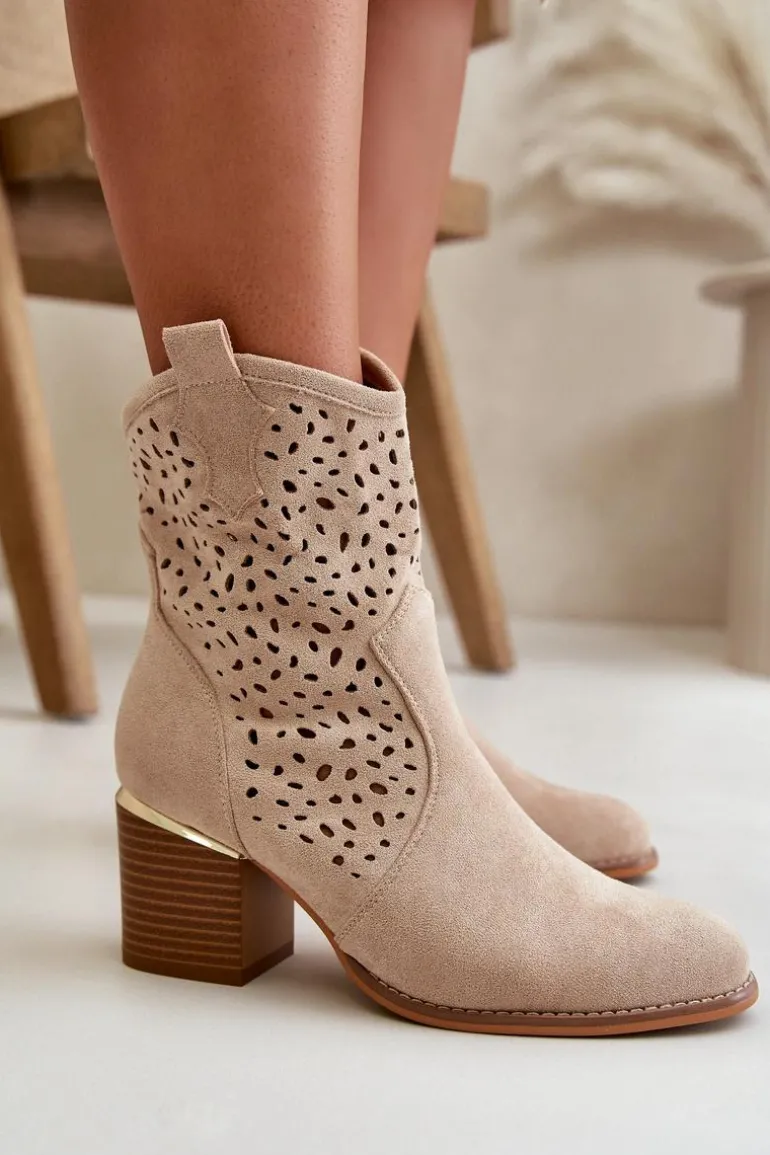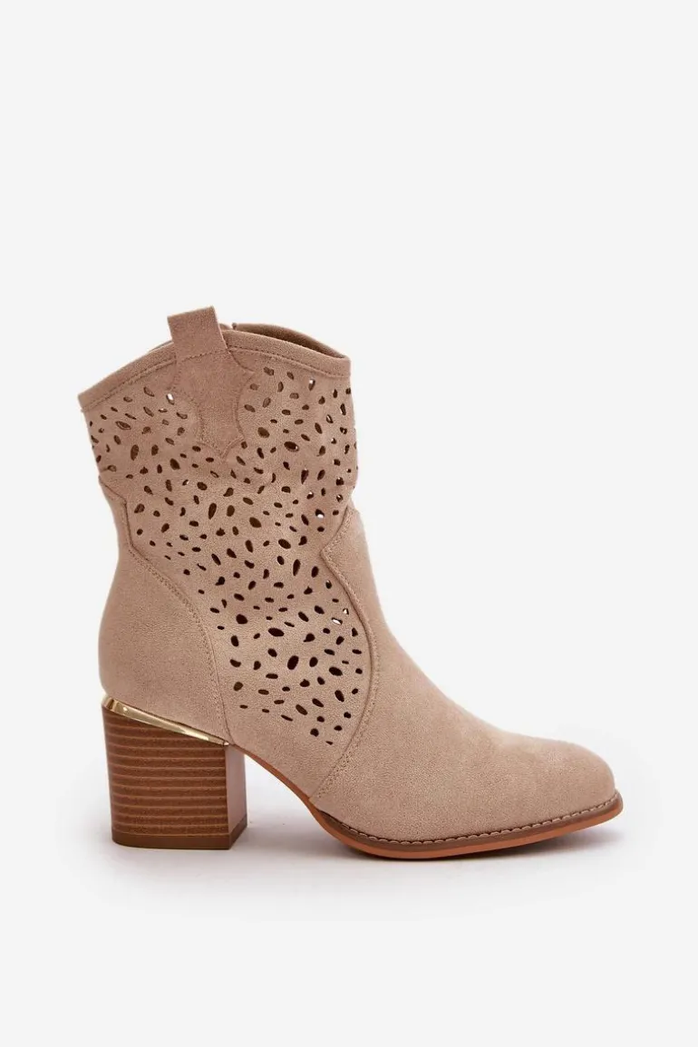 Damskie botki wykonane z eko zamszu, wyróżniają się ażurową cholewką, która sięga za kostkę. Osadzone na eleganckim słupkowym obcasie, ozdobionym złotym elementem, co dodaje im wyjątkowego charakteru. Zapinane na zamek, zapewniają wygodę użytkowania. Noski zaokrąglone, co podkreśla ich klasyczny i stylowy wygląd. Idealne do codziennych i eleganckich stylizacji. Przy wyborze rozmiaru prosimy sugerować się tabelą rozmiarów.