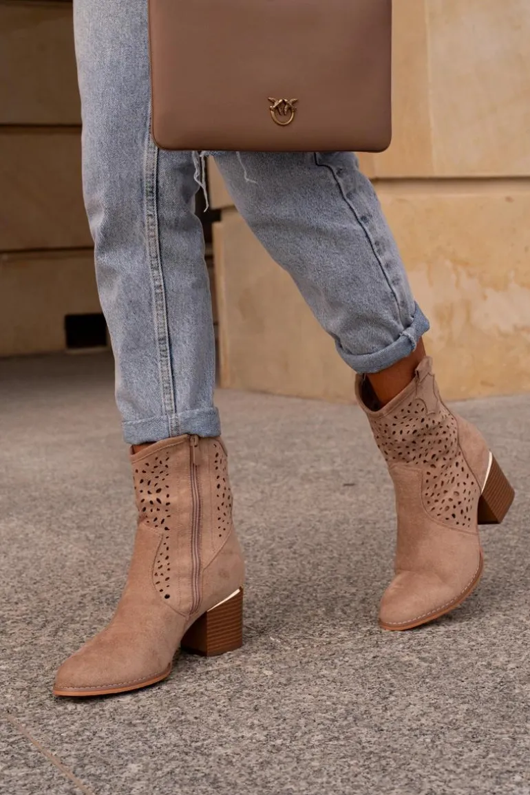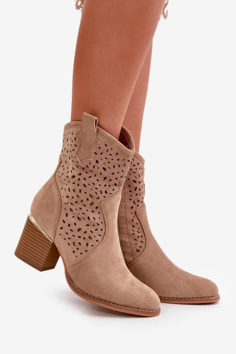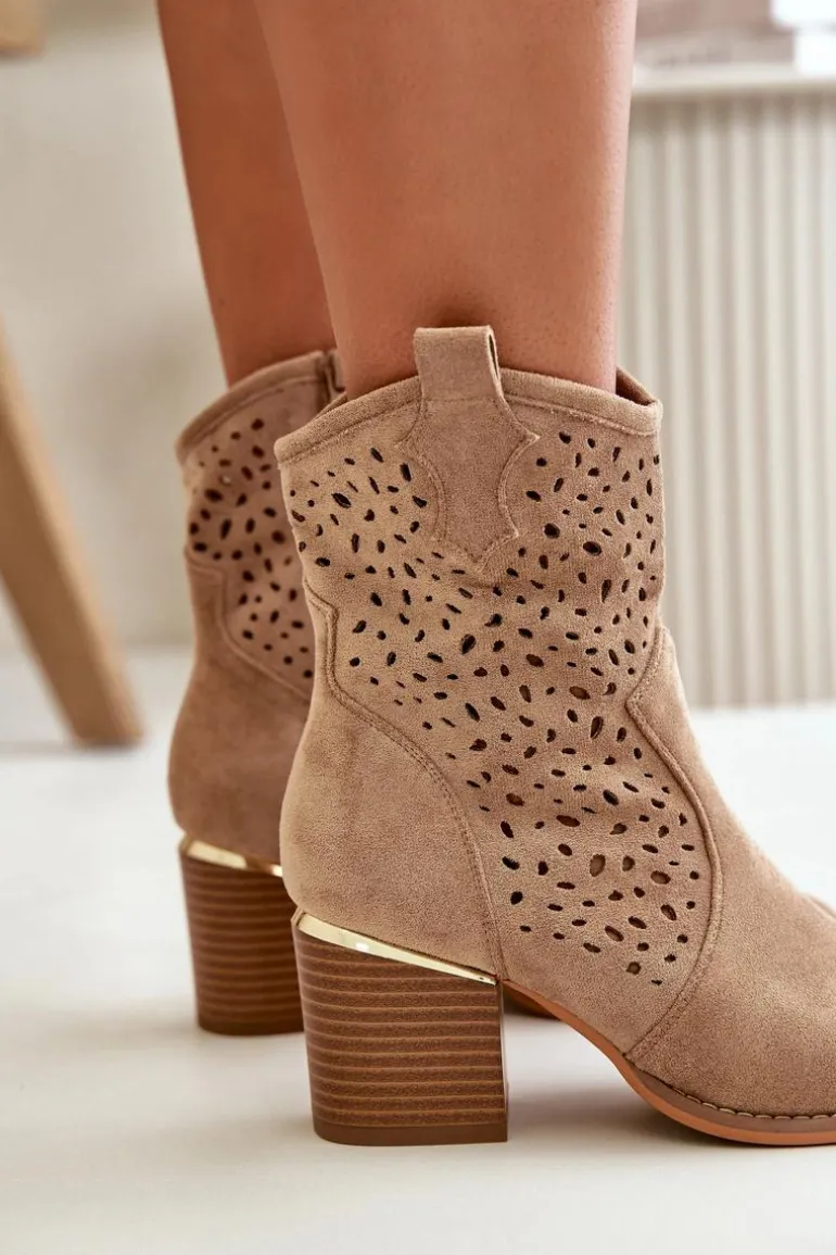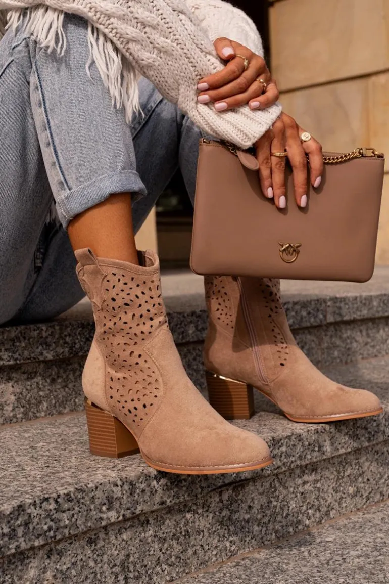 Damskie botki wykonane z eko zamszu, wyróżniają się ażurową cholewką, która sięga za kostkę. Osadzone na eleganckim słupkowym obcasie, ozdobionym złotym elementem, co dodaje im wyjątkowego charakteru. Zapinane na zamek, zapewniają wygodę użytkowania. Noski zaokrąglone, co podkreśla ich klasyczny i stylowy wygląd. Idealne do codziennych i eleganckich stylizacji. Przy wyborze rozmiaru prosimy sugerować się tabelą rozmiarów.