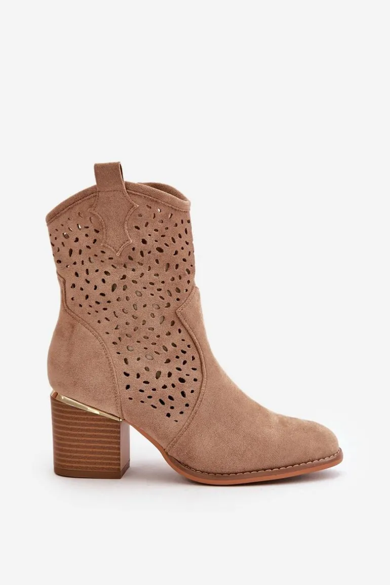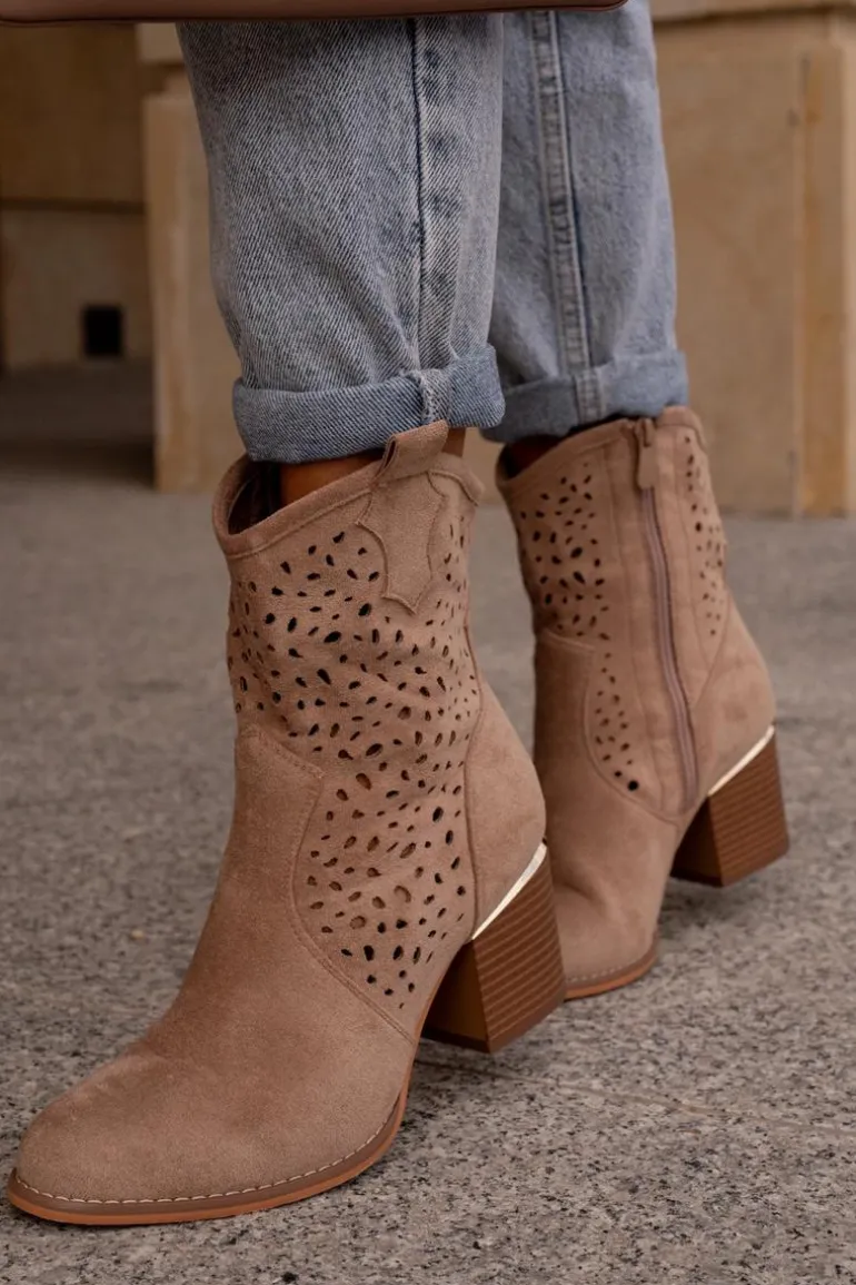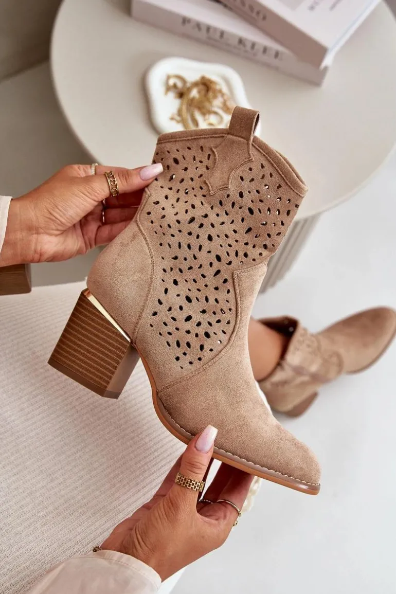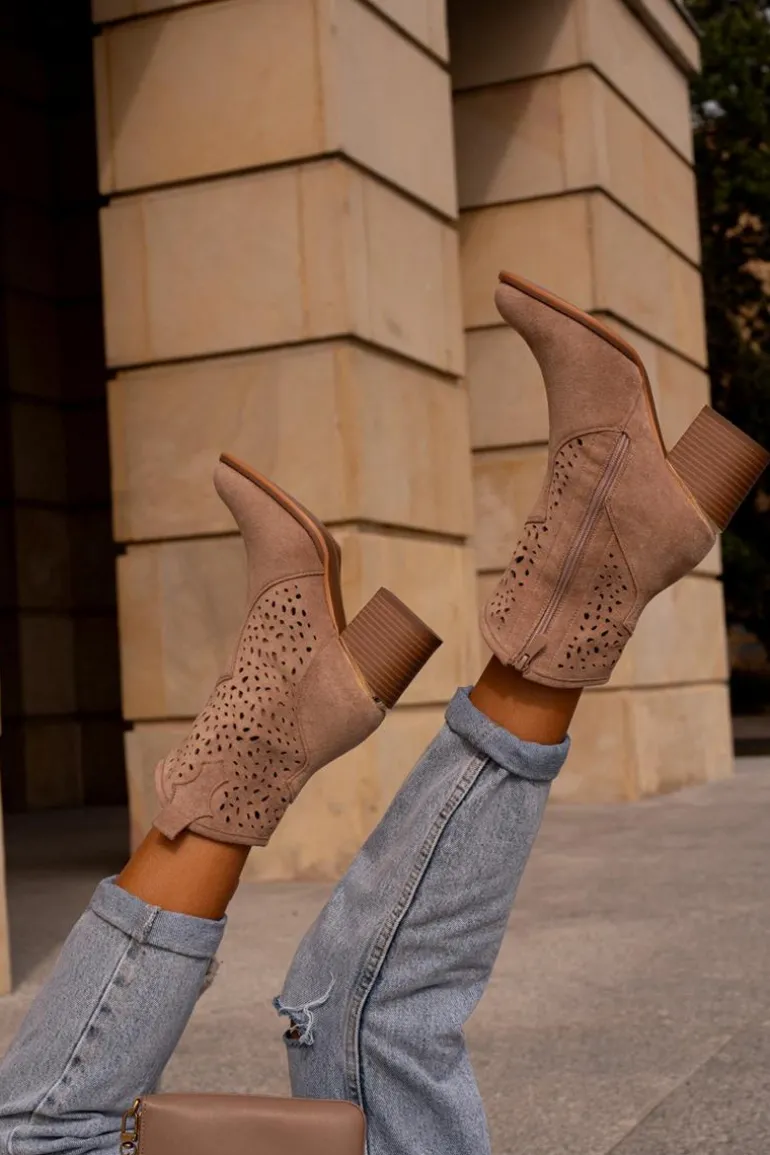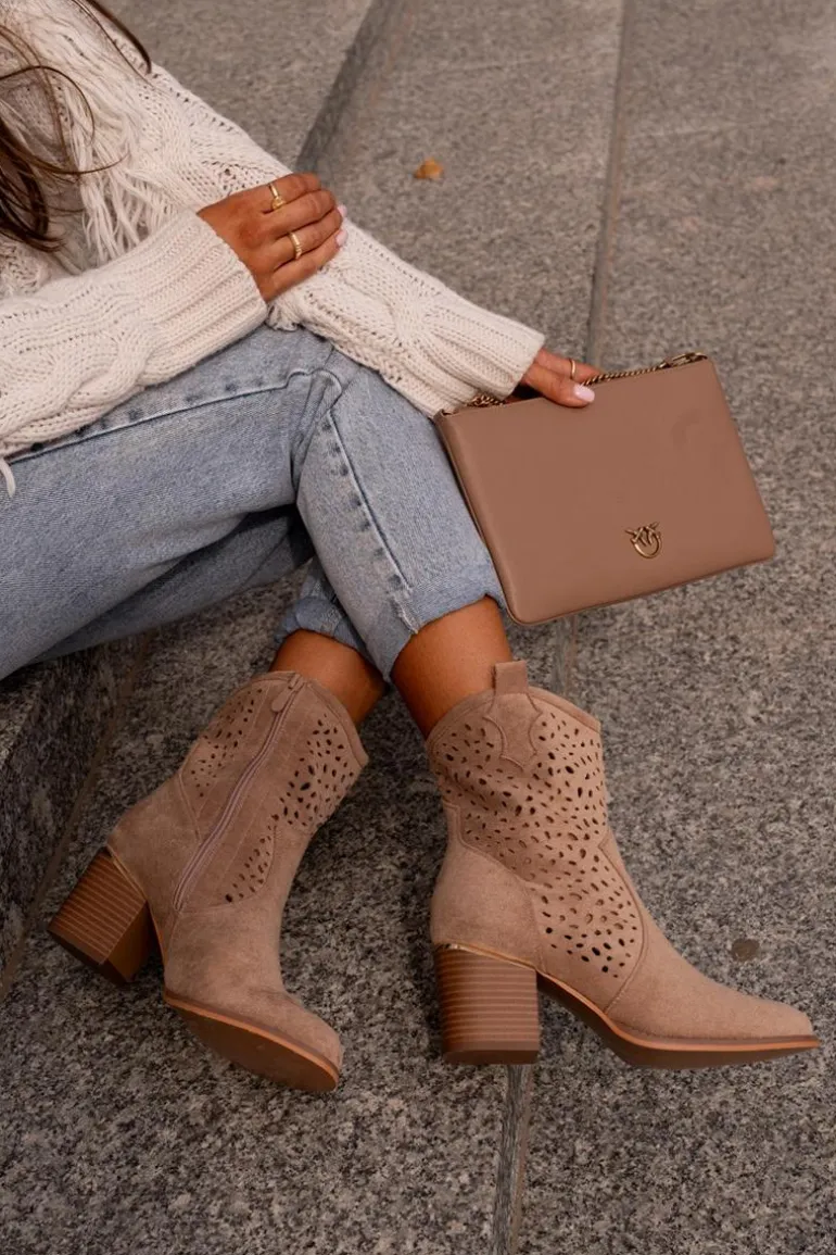 Damskie botki wykonane z eko zamszu, wyróżniają się ażurową cholewką, która sięga za kostkę. Osadzone na eleganckim słupkowym obcasie, ozdobionym złotym elementem, co dodaje im wyjątkowego charakteru. Zapinane na zamek, zapewniają wygodę użytkowania. Noski zaokrąglone, co podkreśla ich klasyczny i stylowy wygląd. Idealne do codziennych i eleganckich stylizacji. Przy wyborze rozmiaru prosimy sugerować się tabelą rozmiarów.
