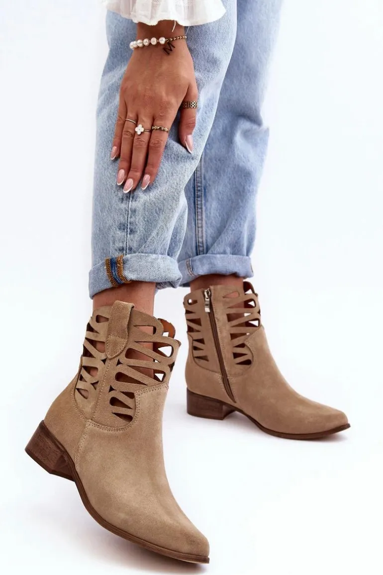 Damskie botki zostały wykonane z wysokiej jakości skóry naturalnej. Zapinane na suwak z boku. Osadzone na płaskim obcasie, co sprawia, że są niezwykle wygodne i stabilne. Noski w szpic optycznie wysmuklą nogi. Dodatkowo zapiętek jest usztywniony. Model ten posiada miękką wkładkę wykonaną z naturalnej skóry. Przy wyborze rozmiaru prosimy sugerować się tabelą rozmiarów.