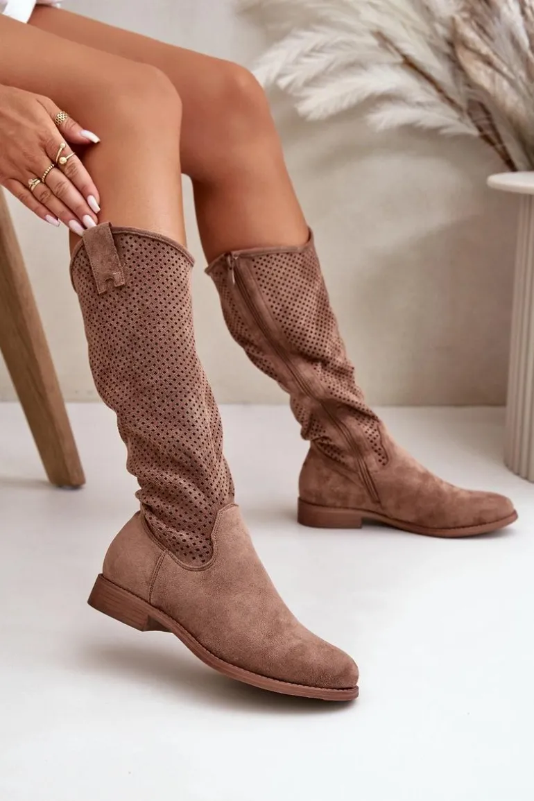 Kozaki z ażurową cholewką przed kolano. Wykonane z eko zamszu. Osadzone na płaskim, stabilnym obcasie. Zapinane na zamek. Noski zaokrąglone. Z tymi kozakami stworzysz wiele ciekawych stylizacji na co dzień. Koniecznie powinnaś je mieć w swojej szafie! Przy wyborze rozmiaru prosimy sugerować się tabelą rozmiarów.