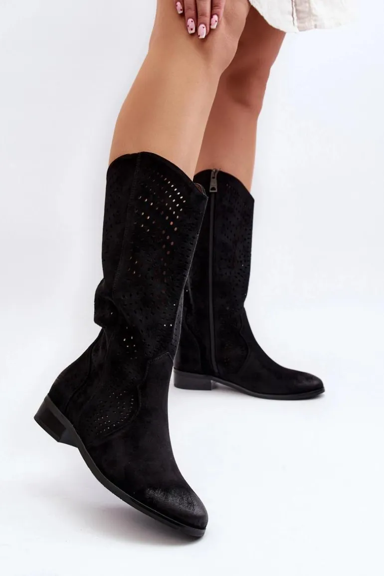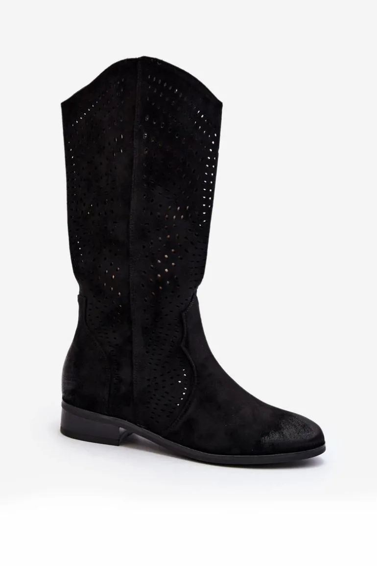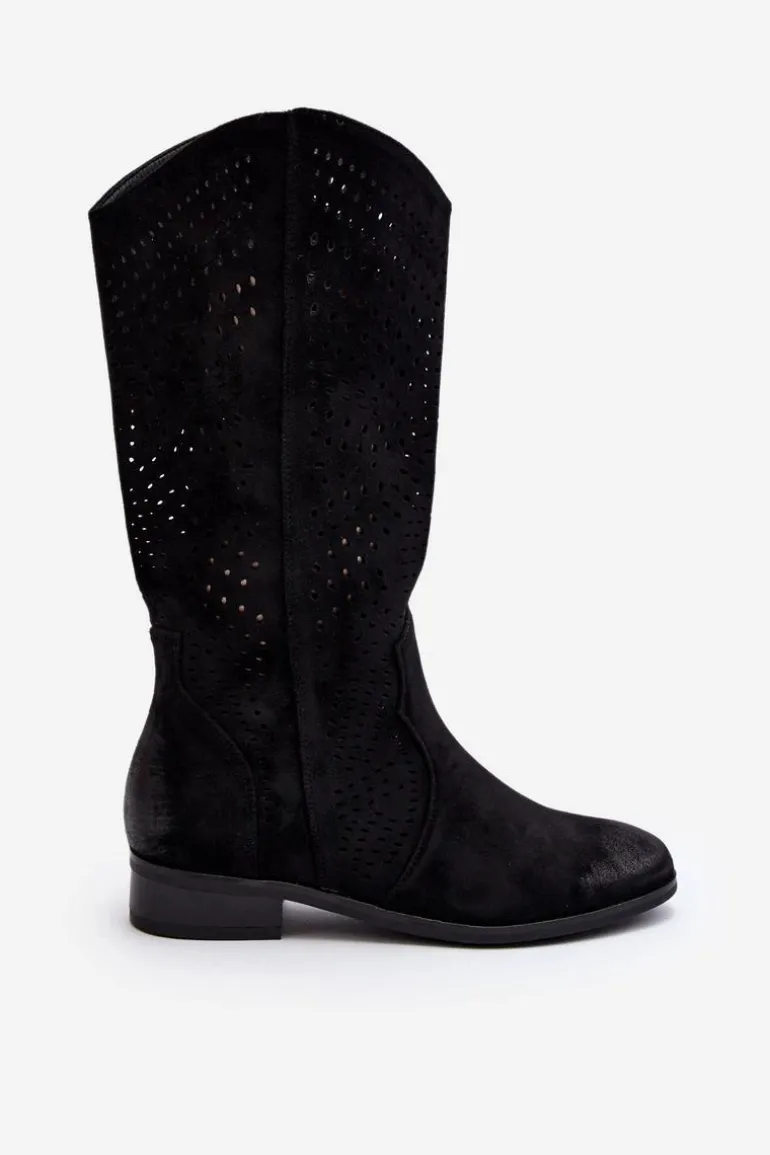Kozaki damskie z ażurową cholewką idealnie dopełnią wiosenne stylizacje. Wykonane z eko zamszu. Osadzone na płaskim, stabilnym obcasie. Noski zaokrąglone. Model ten zapinany jest na zamek. Wkładka wykonana ze skóry naturalnej. Koniecznie musisz je mieć! Przy wyborze rozmiaru prosimy sugerować się tabelą rozmiarów.