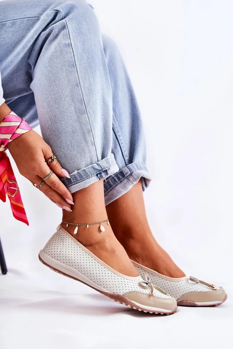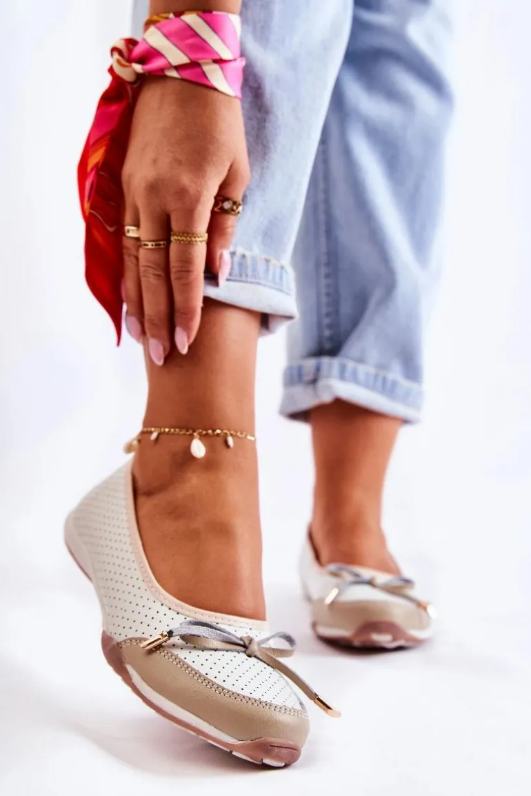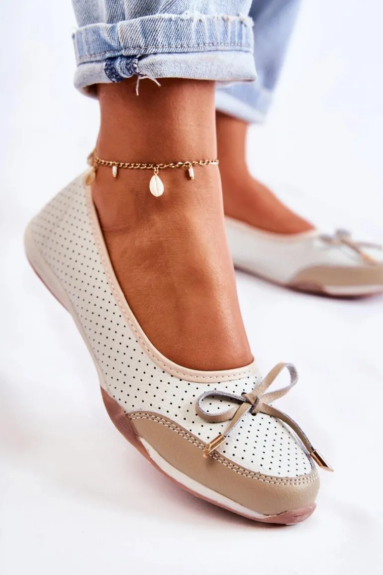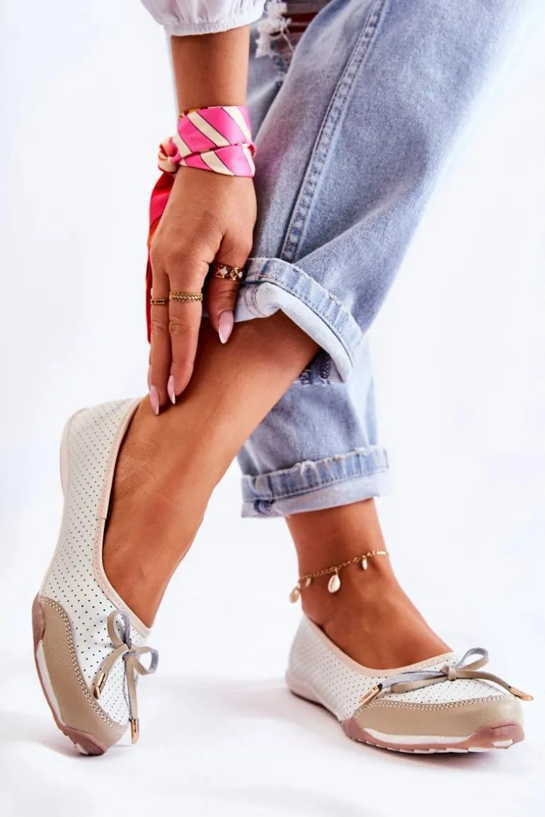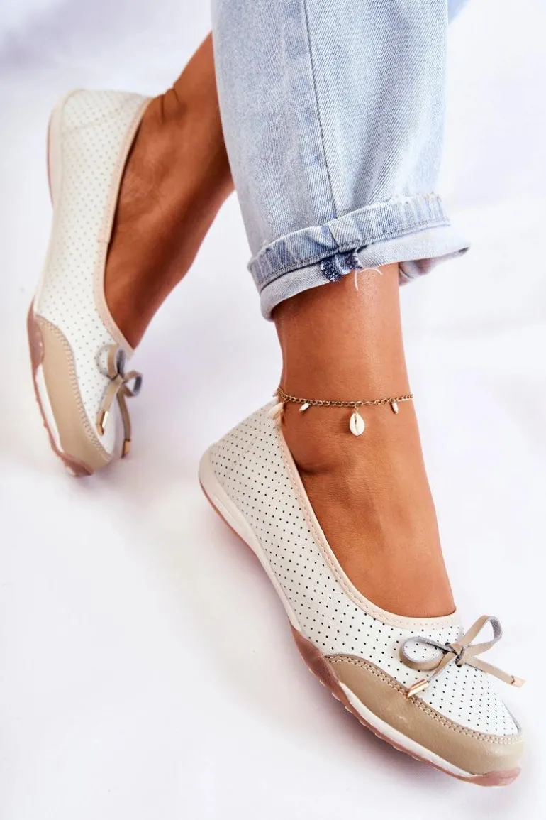 Ażurowe Skórzane Baleriny Biało-Beżowe Erdola