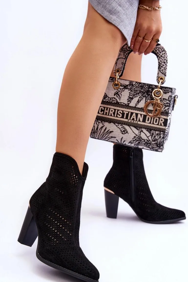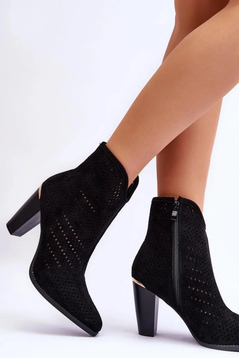 Cudowne, damskie botki z cholewką zapinaną na suwak. Buty te zostały wykonane z ekologicznego zamszu z ażurowym wzorem na całości cholewki. Eko skórzana wkładka oraz usztywniany zapiętek zapewniają wygodne użytkowanie. Botki osadzono na obcasie w postaci słupka ze zdobieniem. Świetny model do wielu stylizacji! Przy wyborze rozmiaru prosimy sugerować się tabelą rozmiarów.