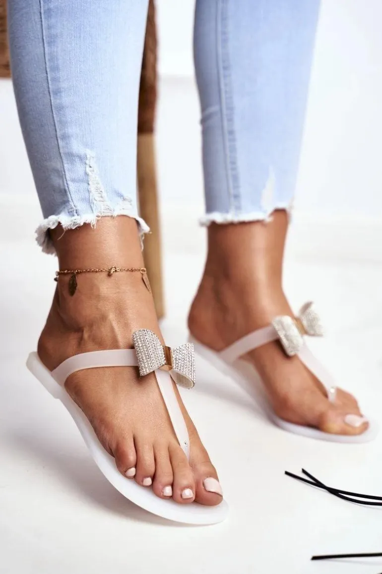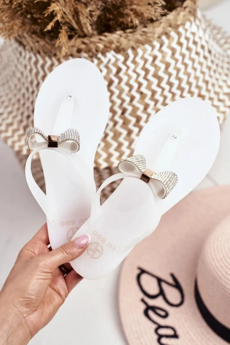 Białe Damskie Klapki Japonki Meliski z Kokardką Cekiny Morello