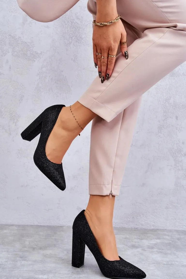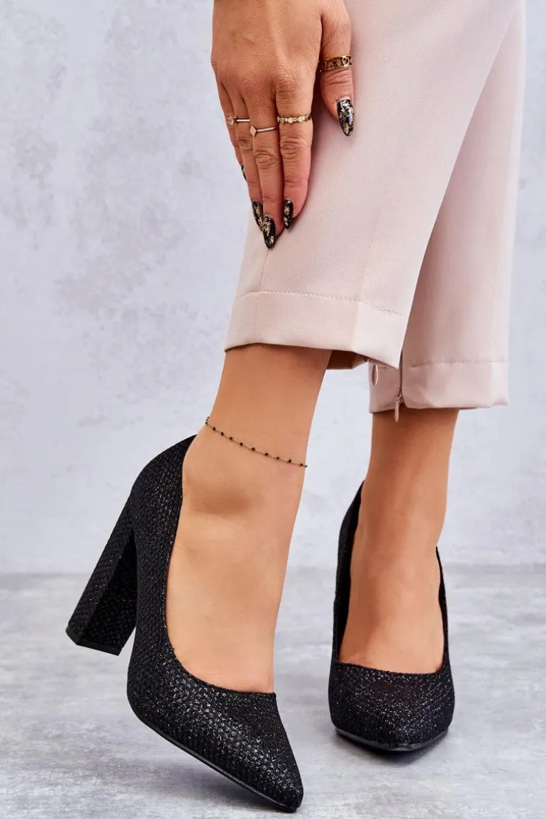 Klasyczne czółenka zostały wykonane z błyszczącego materiału o ciekawym splocie. Idealny model na różnego rodzaju imprezy czy okolicznościowe spotkania. Nosek w szpic oraz obcas w postaci słupka optycznie wysmukli nogi. Wkładka została wykonana z miękkiej eko skóry, co zwiększa komfort użytkowania obuwia. Przy wyborze rozmiaru prosimy sugerować się tabelą rozmiarów.