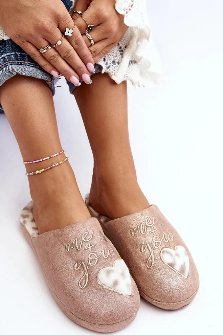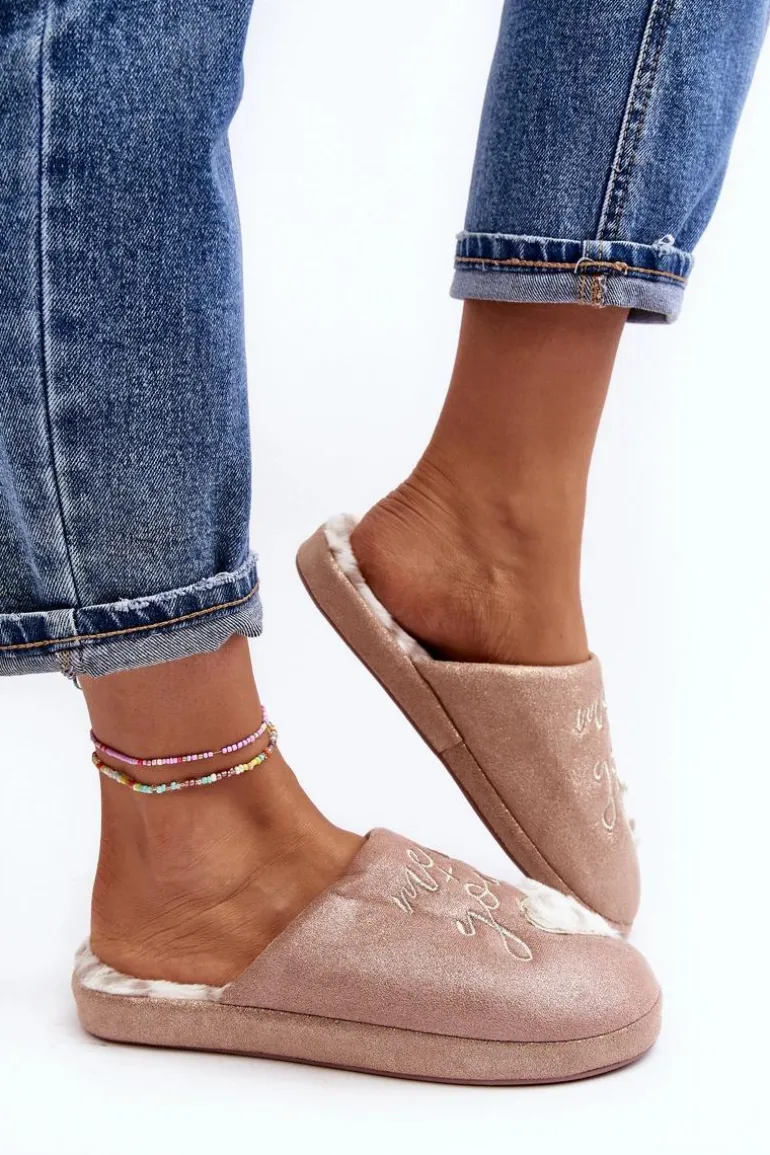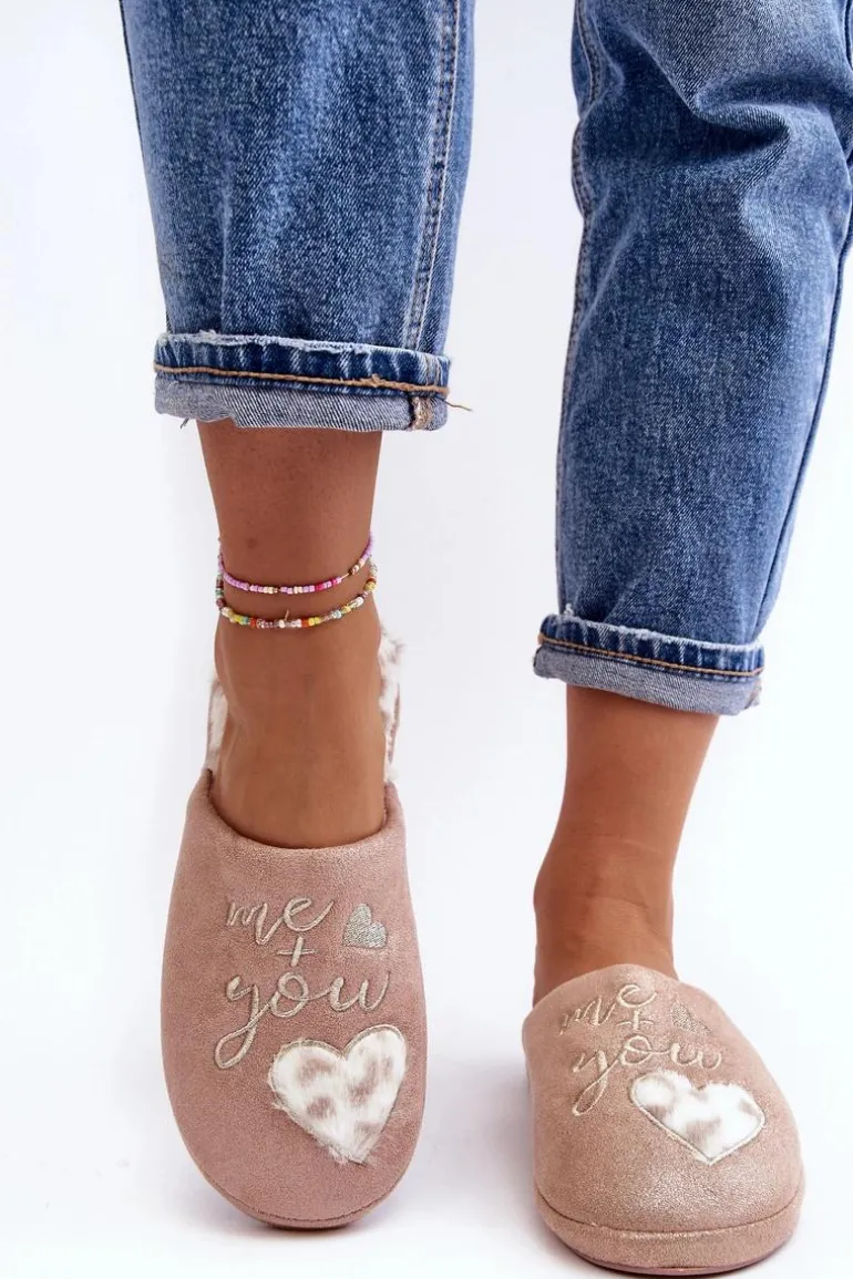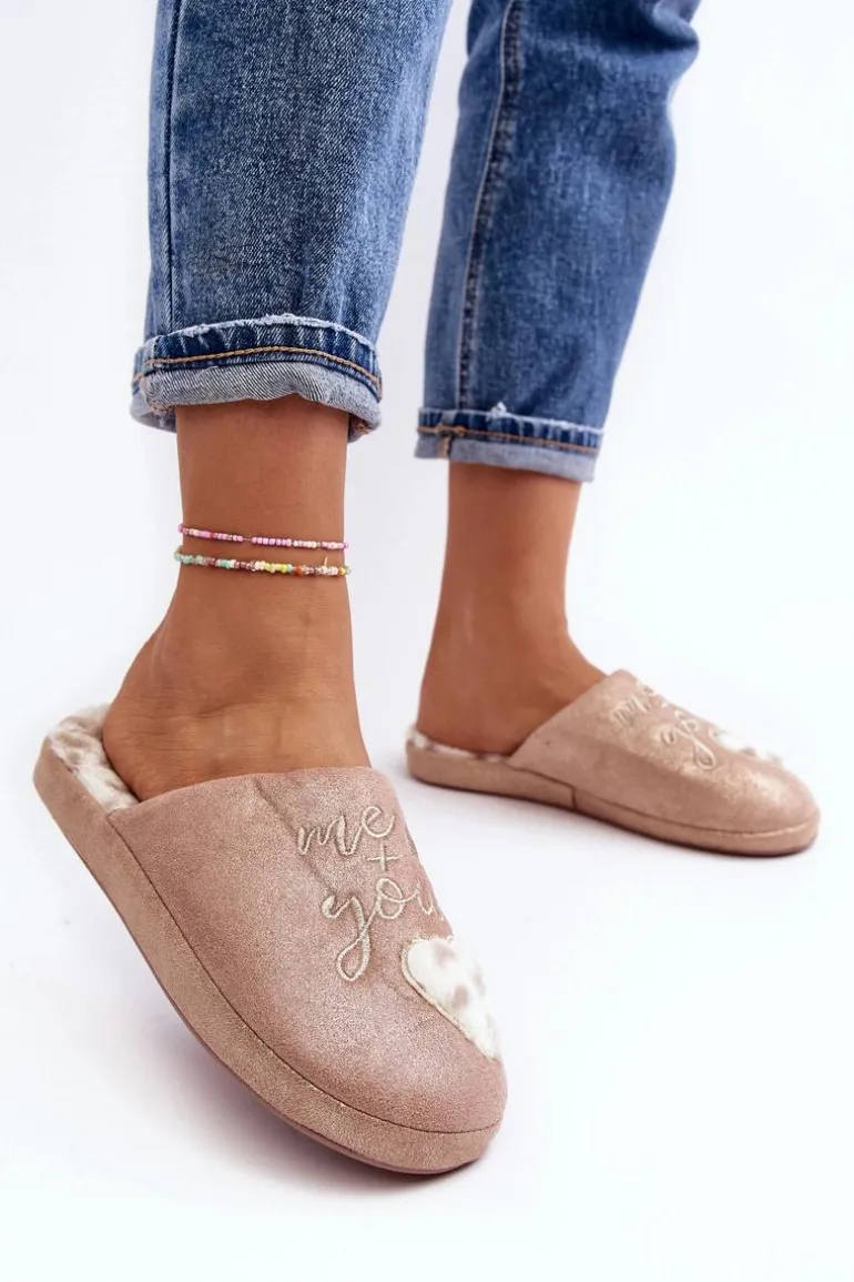 Błyszczące kapcie damskie ozdobione napisem i sercem. Model wsuwany z zakrytym noskiem. Osadzone na grubej podeszwie. Wkładka ocieplona futerkiem. Przy wyborze rozmiaru prosimy kierować tabelą rozmiarów.
