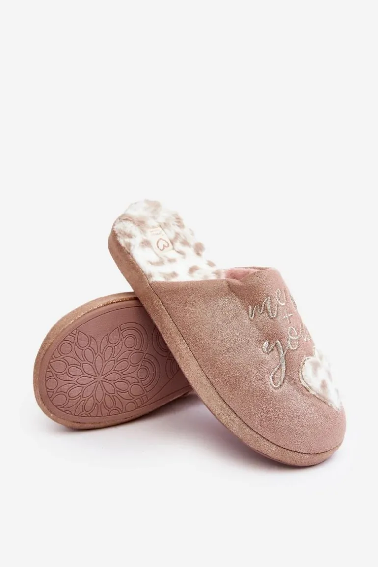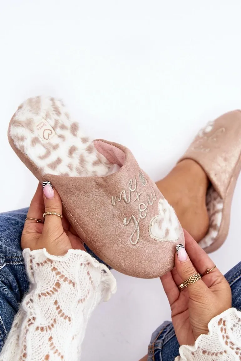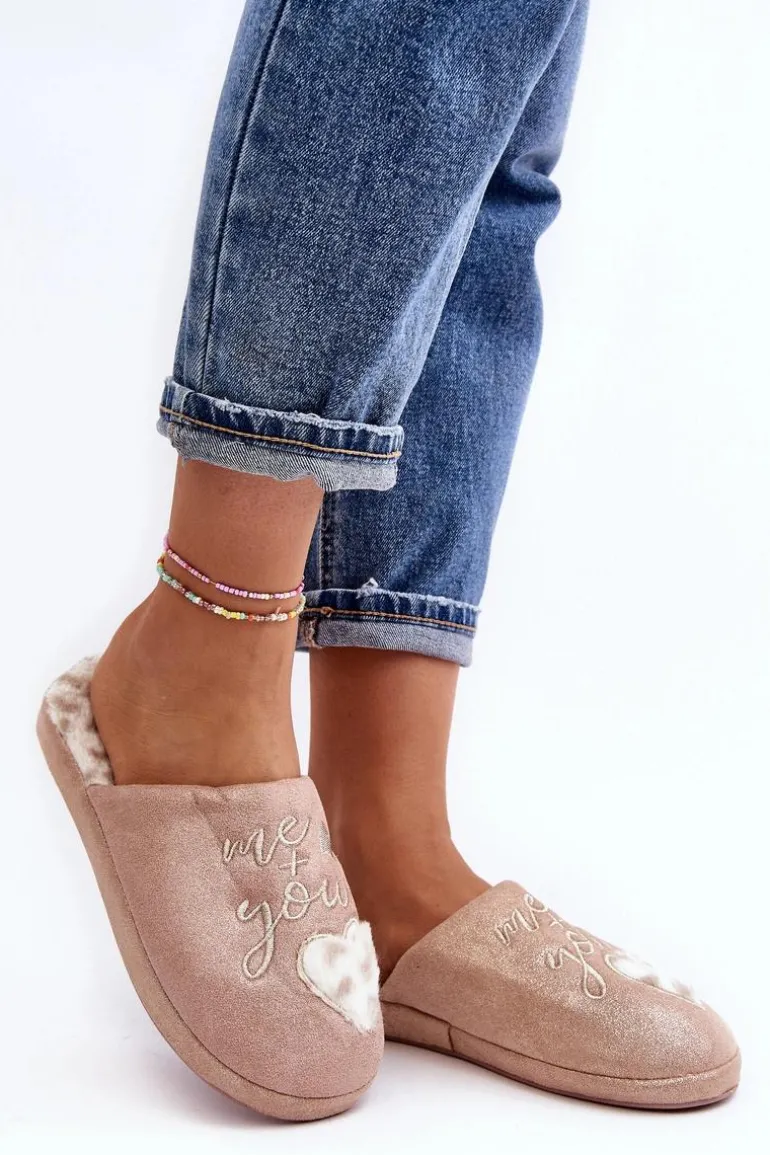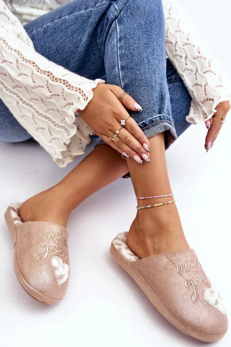 Błyszczące kapcie damskie ozdobione napisem i sercem. Model wsuwany z zakrytym noskiem. Osadzone na grubej podeszwie. Wkładka ocieplona futerkiem. Przy wyborze rozmiaru prosimy kierować tabelą rozmiarów.
