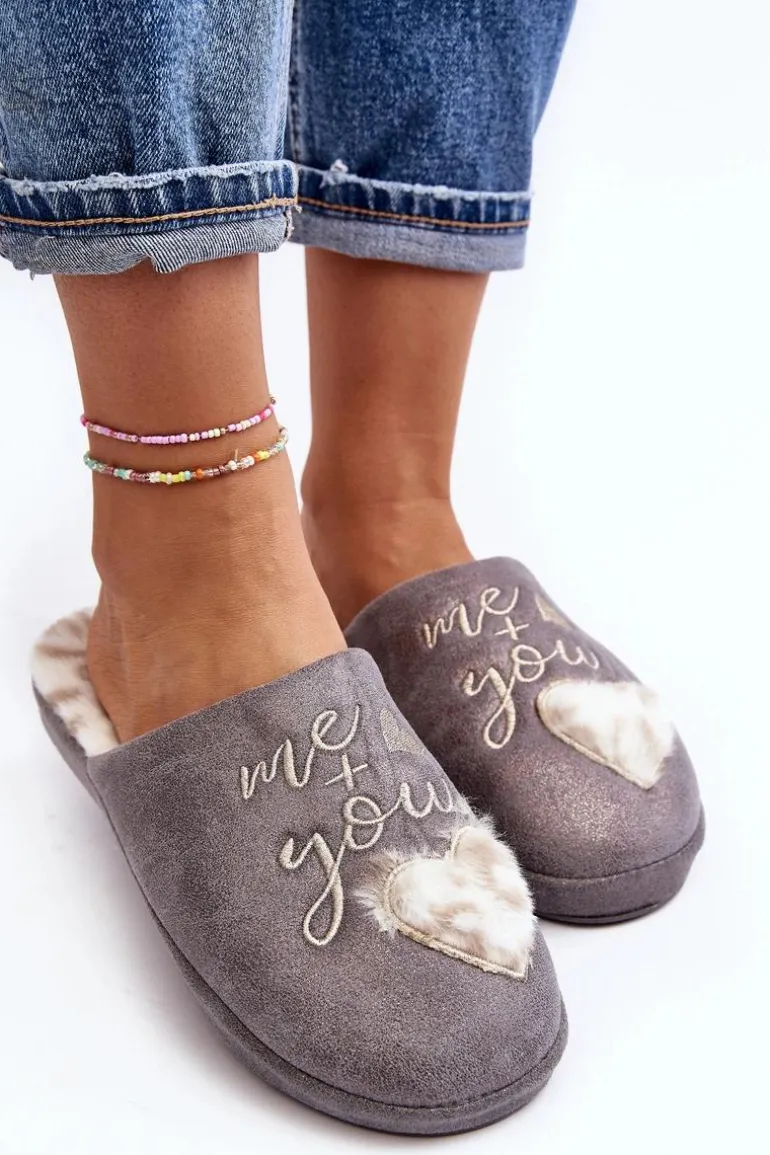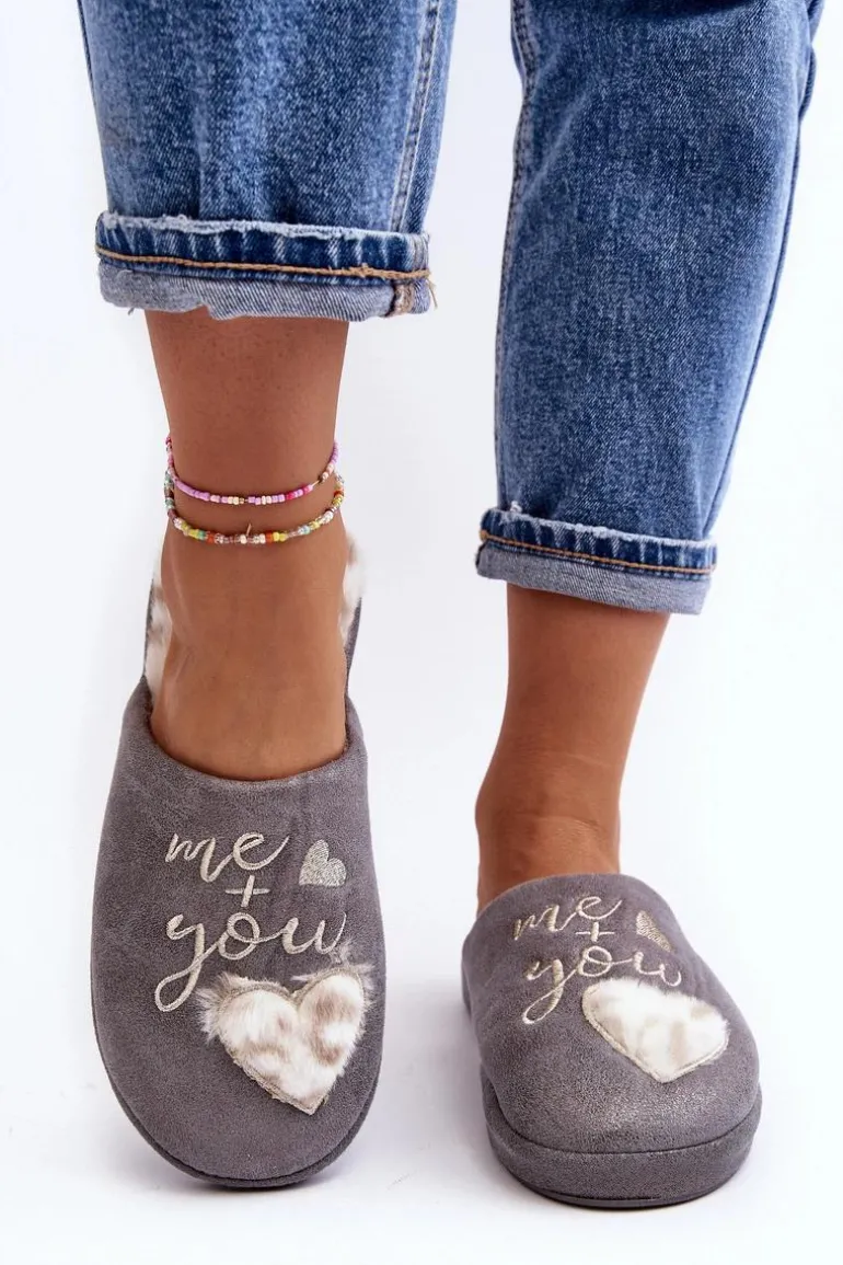 Błyszczące kapcie damskie ozdobione napisem i sercem. Model wsuwany z zakrytym noskiem. Osadzone na grubej podeszwie. Wkładka ocieplona futerkiem. Przy wyborze rozmiaru prosimy kierować tabelą rozmiarów.