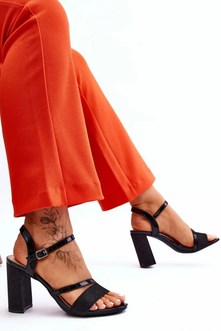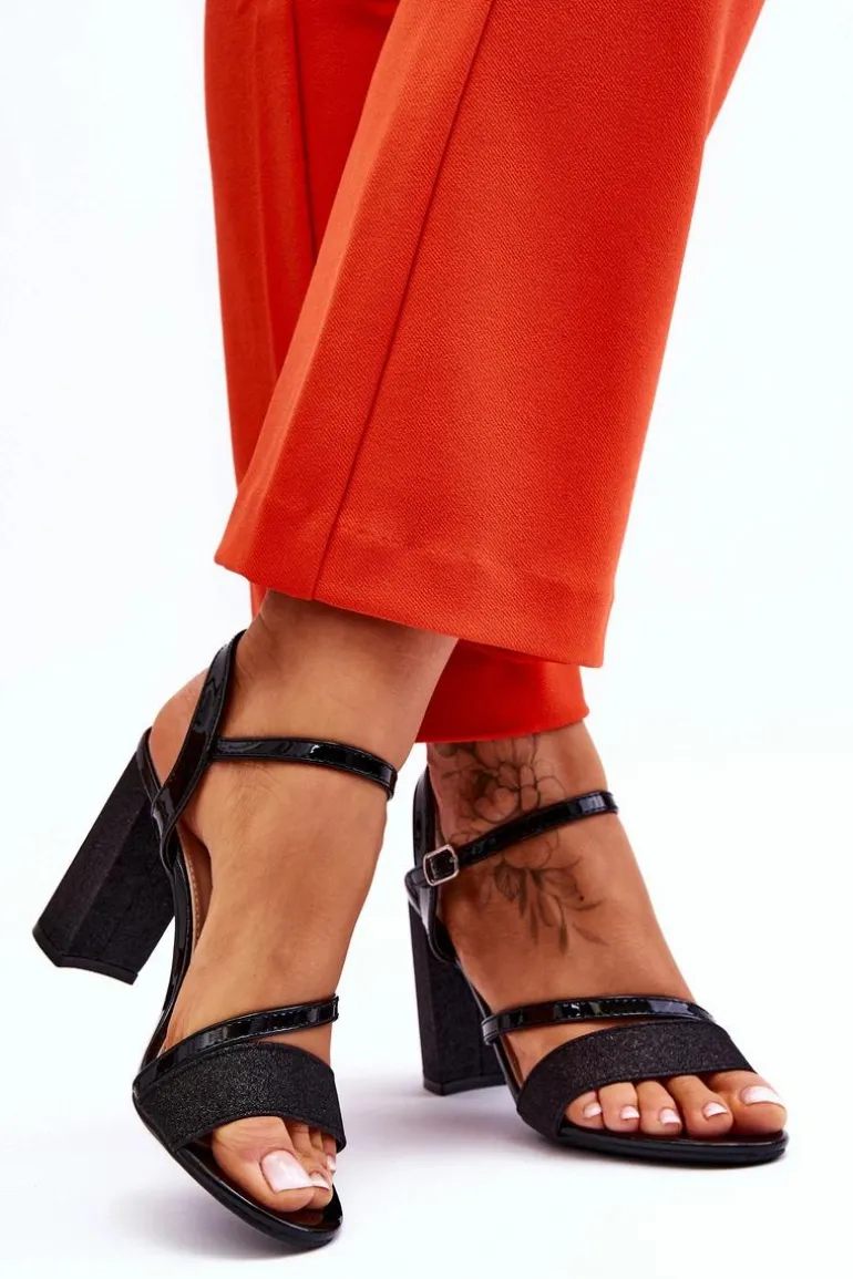 Piękne sandały na obcasie w postaci słupka. Buty te zostały wykonane z eko skóry. Dodatkowo paseczek z przodu oraz obcas są brokatowe, przez co buty wyglądają naprawdę elegancko. Miękka wkładka z eko skóry zapewni komfort podczas użytkowania. Buty posiadają regulowany pasek zapinany na sprzączkę wokół kostki. Model ten wykorzystasz podczas wielu uroczystości rodzinnych, imprez ze znajomymi czy biznesowych spotkań. Przy wyborze rozmiaru prosimy sugerować się tabelą rozmiarów.