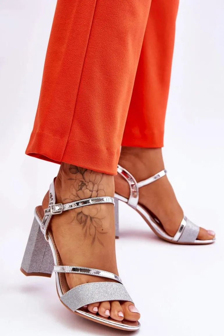 Piękne sandały na obcasie w postaci słupka. Buty te zostały wykonane z eko skóry. Dodatkowo paseczek z przodu oraz obcas są brokatowe, przez co buty wyglądają naprawdę elegancko. Miękka wkładka z eko skóry zapewni komfort podczas użytkowania. Buty posiadają regulowany pasek zapinany na sprzączkę wokół kostki. Model ten wykorzystasz podczas wielu uroczystości rodzinnych, imprez ze znajomymi czy biznesowych spotkań. Przy wyborze rozmiaru prosimy sugerować się tabelą rozmiarów.
