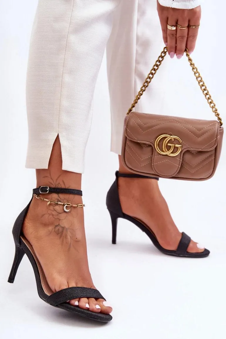 Klasyczne, brokatowe sandały zostały osadzone na obcasie w postaci szpilki. Model ten posiada usztywniany zapiętek oraz zapięcie na cienki pasek ze sprzączką. Wysoki obcas i miękka, eko skórzana wkładka zapewni dobre samopoczucie oraz gustowny wygląd. Przy wyborze rozmiaru prosimy sugerować się tabelą rozmiarów.