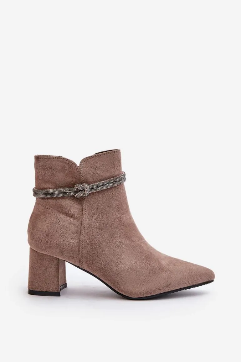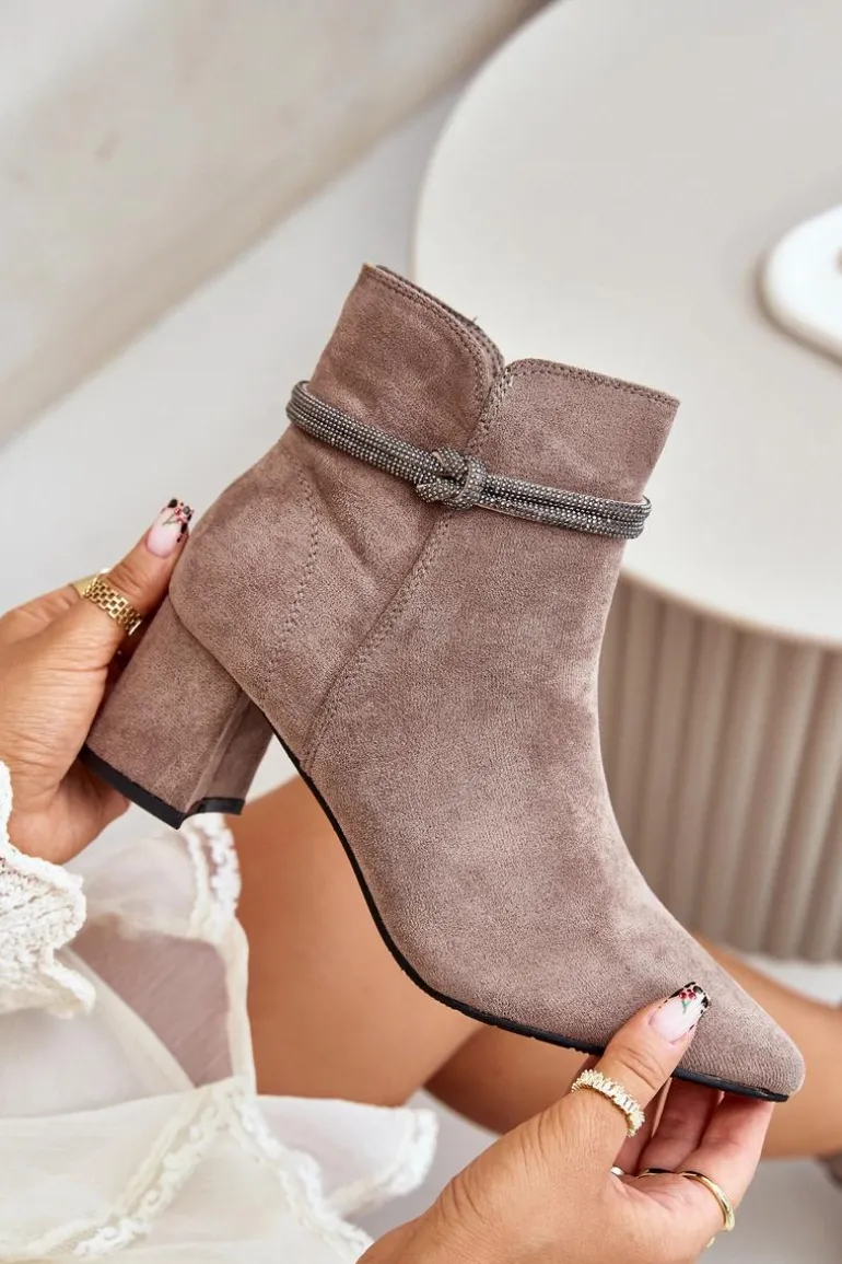 Botki damskie z cholewką sięgającą za kostkę. Wykonane z miłego w dotyku eko zamszu. Osadzone na obcasie w formie słupka. Cholewka ozdobiona błyszczącym paseczkiem. Noski w szpic optycznie wysmuklą nogi. Zapięcie na zamek gwarantuje łatwe zakładanie i zdejmowanie butów, co jest szczególnie praktyczne w codziennym użytkowaniu. Przy wyborze rozmiaru prosimy sugerować się tabelą rozmiarów.
