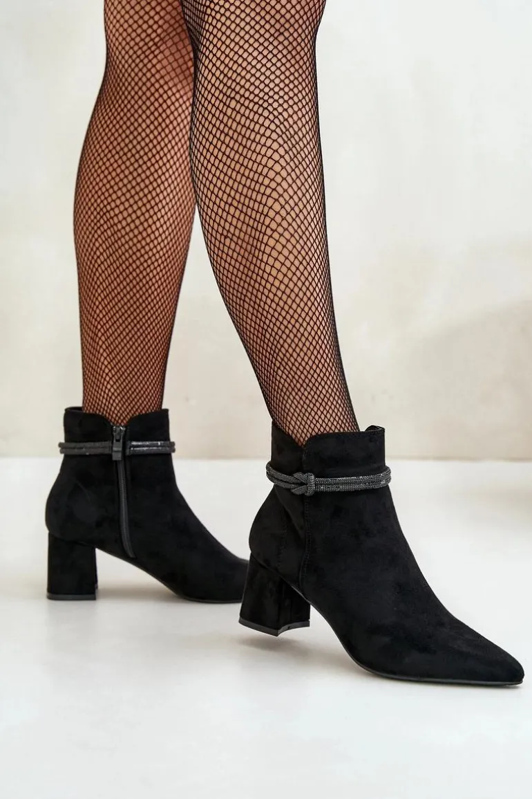 Botki damskie z cholewką sięgającą za kostkę. Wykonane z miłego w dotyku eko zamszu. Osadzone na obcasie w formie słupka. Cholewka ozdobiona błyszczącym paseczkiem. Noski w szpic optycznie wysmuklą nogi. Zapięcie na zamek gwarantuje łatwe zakładanie i zdejmowanie butów, co jest szczególnie praktyczne w codziennym użytkowaniu. Przy wyborze rozmiaru prosimy sugerować się tabelą rozmiarów.