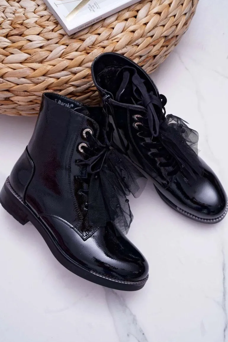 Eleganckie botki firmy S.BARSKI w kolorze czarnym. Wykonane z wysokiej jakości eko – skóry lakierowanej. Posiadają ocieplenie w postaci koca obuwniczego. Zdobienie w postaci kokardy przy sznurowaniu. Podczas wyboru rozmiaru prosimy kierować się tabelą rozmiarów.