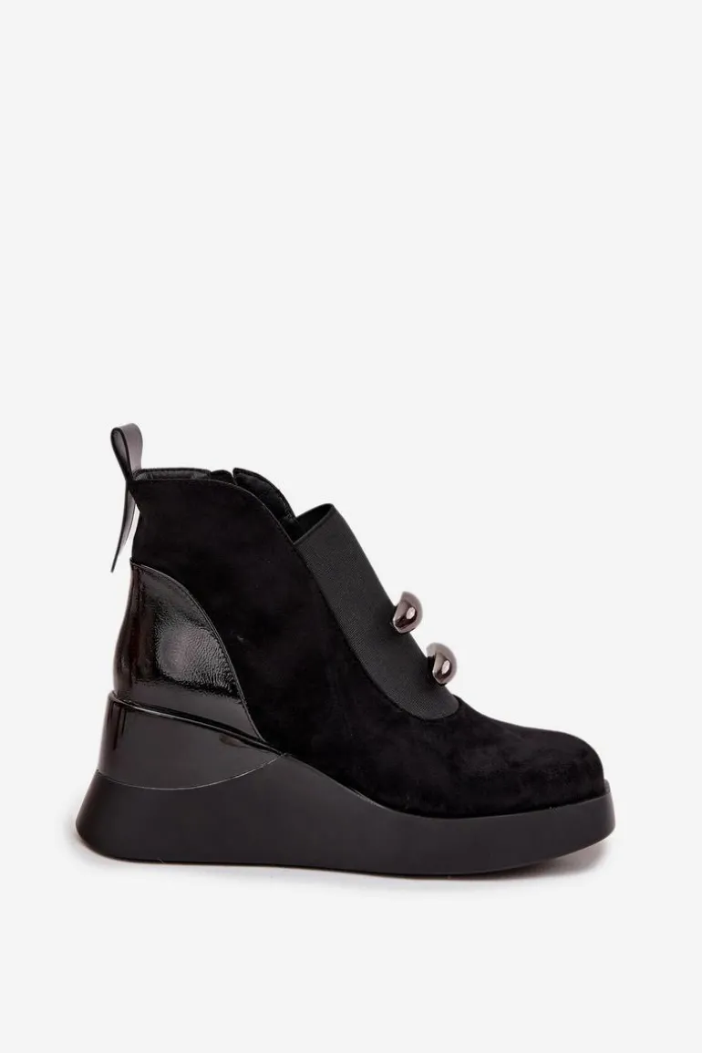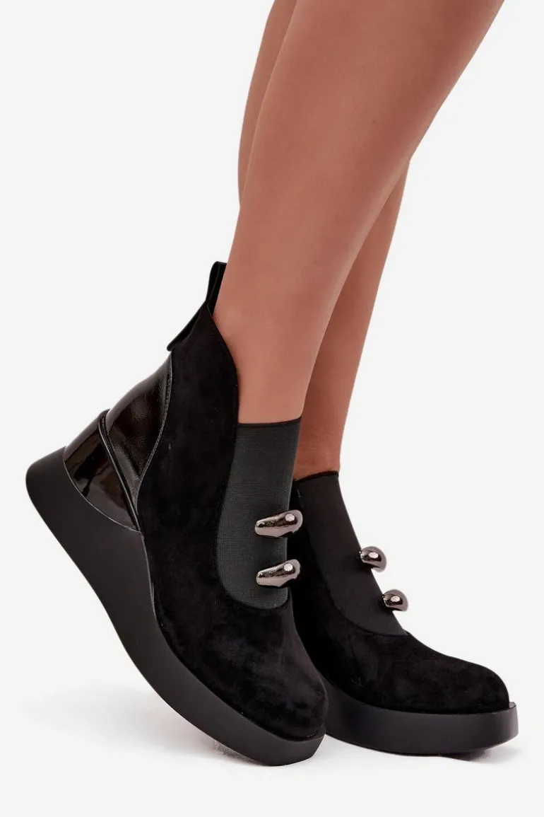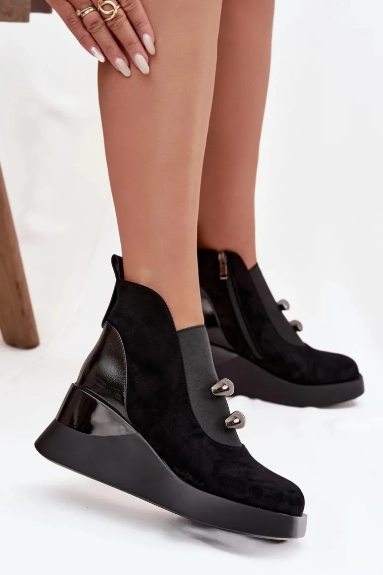 Botki damskie wykonane z eko zamszu. Model osadzony na koturnie subtelnie unosi sylwetkę, zapewniając stabilność i komfort podczas noszenia. Z przodu umieszczono elastyczną wstawkę oraz dwa ozdobne elementy, które dodają wyjątkowego charakteru. Zamek z boku ułatwia zakładanie, a delikatne ocieplenie sprawia, że botki doskonale sprawdzą się w chłodniejsze dni. To uniwersalny model, który świetnie komponuje się zarówno z codziennymi, jak i bardziej eleganckimi stylizacjami, podkreślając ich kobiecy i nowoczesny styl. Przy wyborze rozmiaru prosimy sugerować się tabelą rozmiarów.