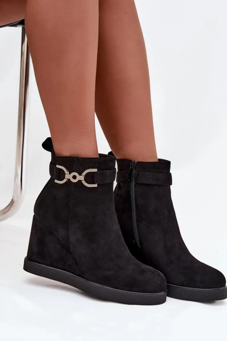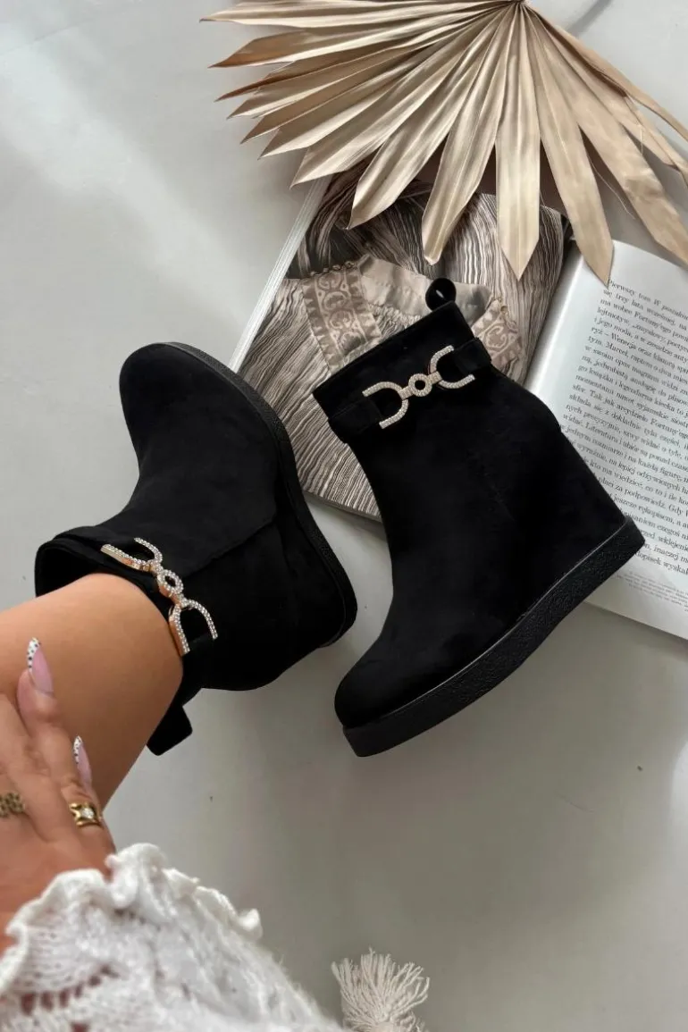 Botki damskie z eko zamszu to stylowa propozycja dla kobiet ceniących wygodę i modny wygląd. Osadzone na koturnie zapewniają komfort noszenia i subtelnie podkreślają sylwetkę, a zaokrąglone noski nadają im klasycznego charakteru. Model wyróżnia się paskiem z ozdobnym detalem umieszczonym na górze cholewki, który dodaje całości eleganckiego akcentu. Zamek po boku ułatwia zakładanie i zdejmowanie, czyniąc buty praktycznym wyborem na co dzień. Przy wyborze rozmiaru prosimy sugerować się tabelą rozmiarów.
