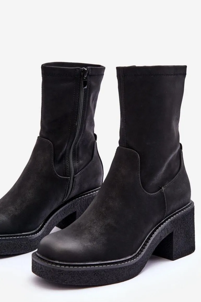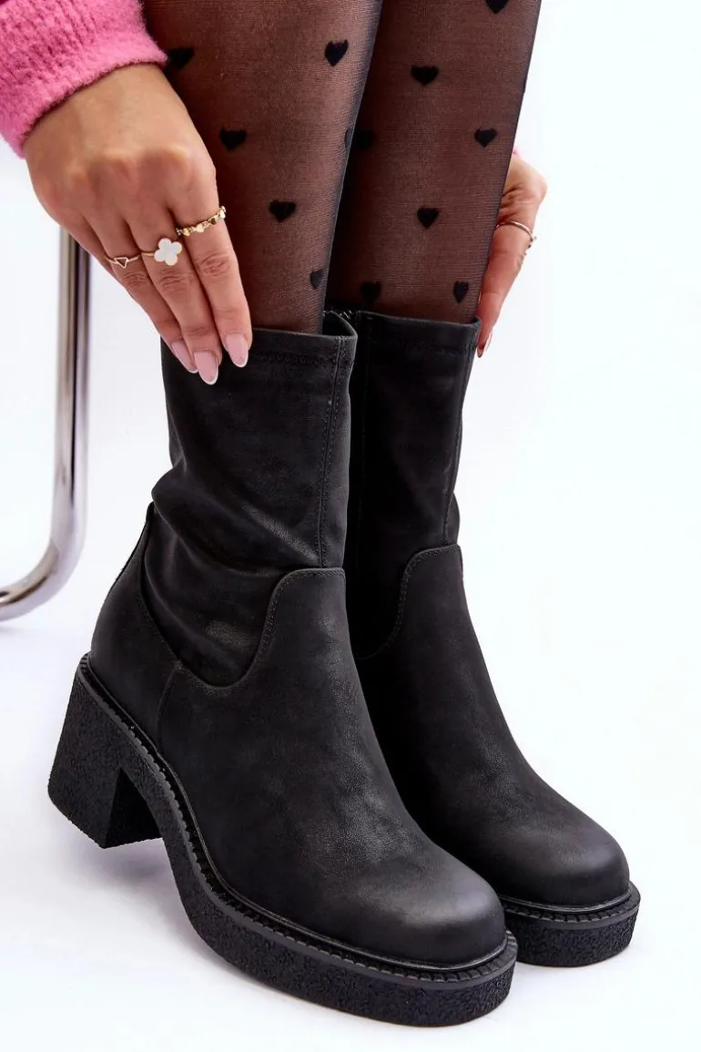 Botki damskie osadzone na masywnym obcasie i platformie. Wykonane z eko skóry. Noski zaokrąglone. Usztywniony zapiętek. Zapinane na suwak z boku. Środek ocieplony na wysokości stopy kocem obuwniczym. Botki doskonale sprawdzą się w jesiennych stylizacjach. Przy wyborze rozmiaru prosimy kierować się tabelą rozmiarów