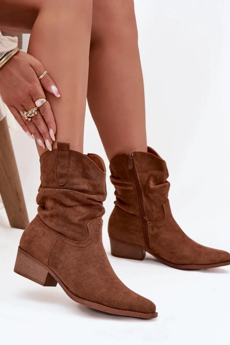 Botki damskie wykonane z eko zamszu. Osadzone na niskim obcasie w formie klocka, zapewniają stabilność i komfort przez cały dzień. Noski w kształcie migdała dodają im subtelności, a zamek błyskawiczny ułatwia zakładanie. Wyróżniają się oryginalną cholewką z marszczeniem, które nadaje im wyjątkowego charakteru. Te botki idealnie komponują się zarówno z codziennymi, jak i bardziej formalnymi stylizacjami. Przy wyborze rozmiaru prosimy sugerować się tabelą rozmiarów.