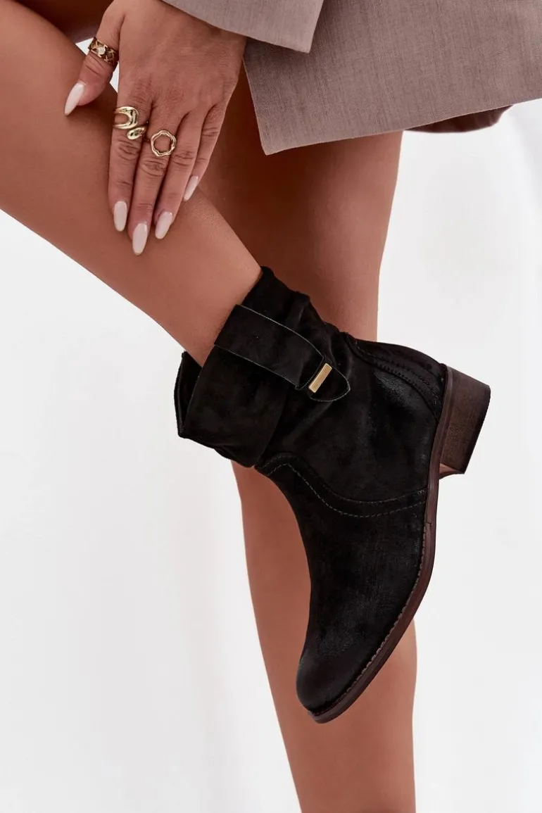 Botki damskie wykonane z miękkiego eko zamszu. Model osadzony na niskim obcasie zapewnia komfort noszenia, a ocieplane wnętrze doskonale sprawdza się w chłodniejsze dni. Zamek ułatwia zakładanie i zdejmowanie butów, natomiast zaokrąglone noski nadają im klasycznego charakteru. Uroku dodaje marszczona cholewka, która podkreśla stylowy, kobiecy wygląd. To uniwersalne botki idealne do codziennych stylizacji – świetnie pasują zarówno do spodni, jak i sukienek.Przy wyborze rozmiaru prosimy sugerować się tabelą rozmiarów.