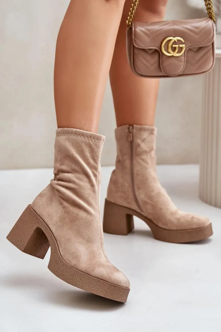 Botki damskie wykonane z eko skóry. Osadzone na masywnym obcasie słupku i platformie. Noski zaokrąglone. Zapinane na zamek. Miękka wkładka zapewni komfortowe użytkowanie. Idealne do stylizacji z sukienkami i spódnicami. Przy wyborze rozmiaru prosimy sugerować się tabelą rozmiarów.