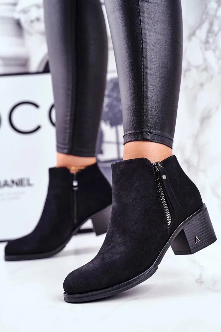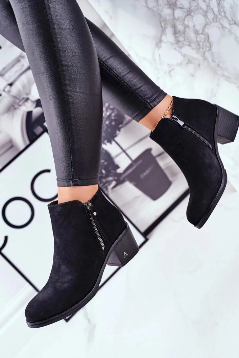 Czarne botki w niecodziennej stylistyce. Zachwyć innych swoimi stylizacjami i wyznacz trendy tego sezonu! Wierzch wykonany ze skóry ekologicznej imitującej nubuk. Wnętrze pokryte kocem obuwniczym, który zagwarantuje nam ciepło nawet w te chłodniejsze dni. Zakładanie ułatwi wszyty na boku suwak. Obcas zdobiony srebrną literką V, natomiast cholewka posiada drugi ozdobny zamek od zewnętrznej strony. Przy wyborze rozmiaru prosimy sugerować się tabelą rozmiarów.