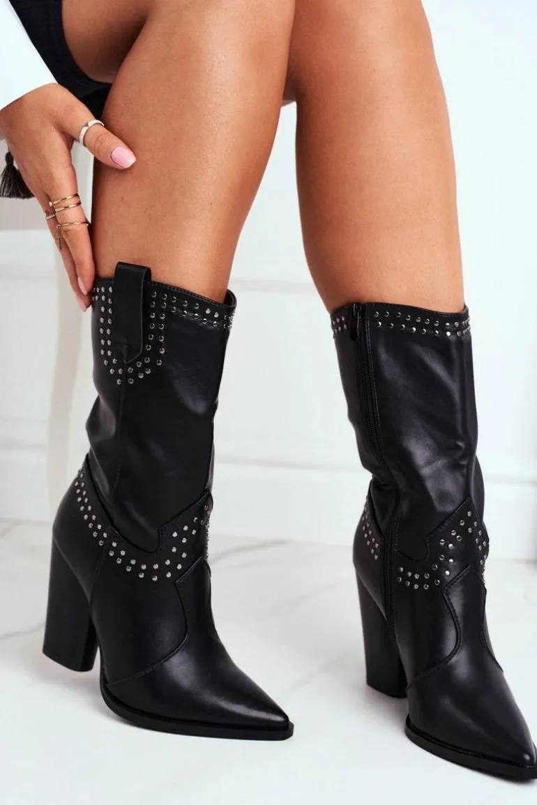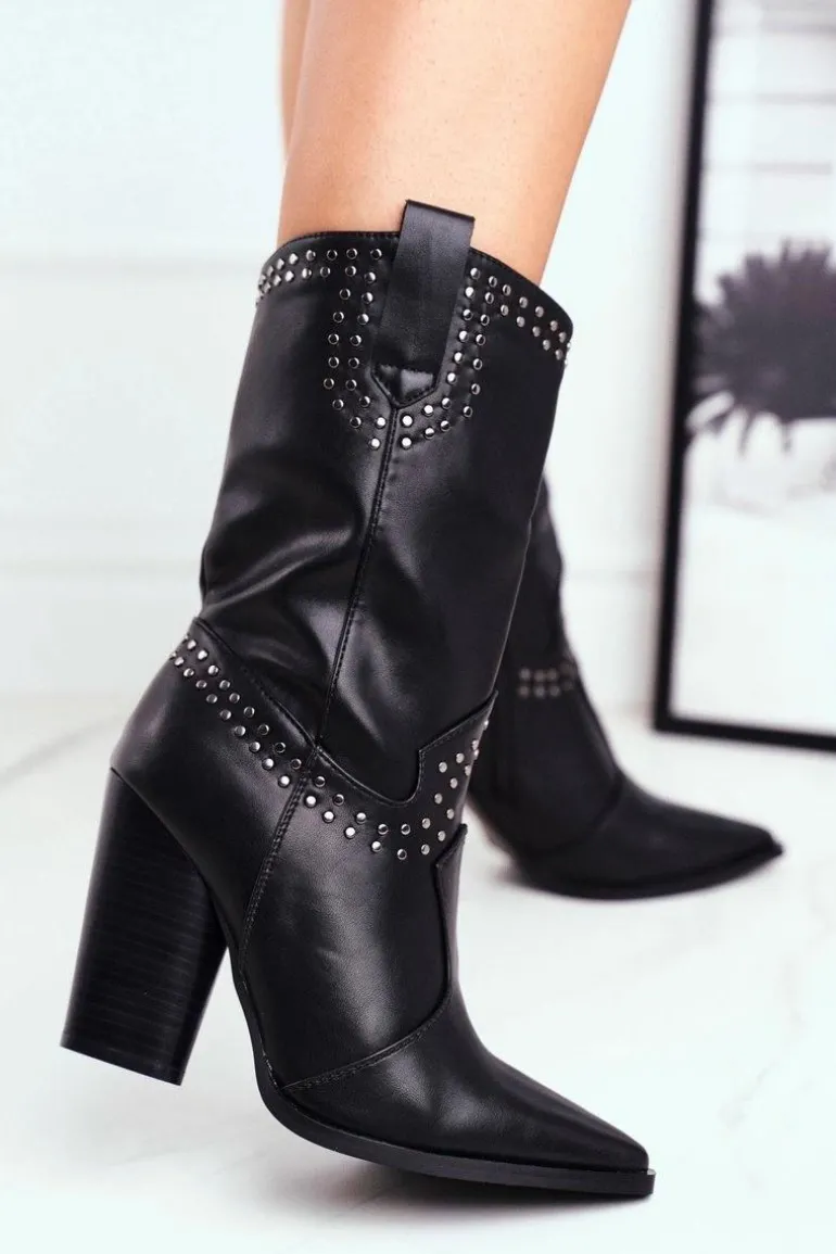 Botki Damskie Na Słupku Ciepłe Kowbojki Czarne Athens