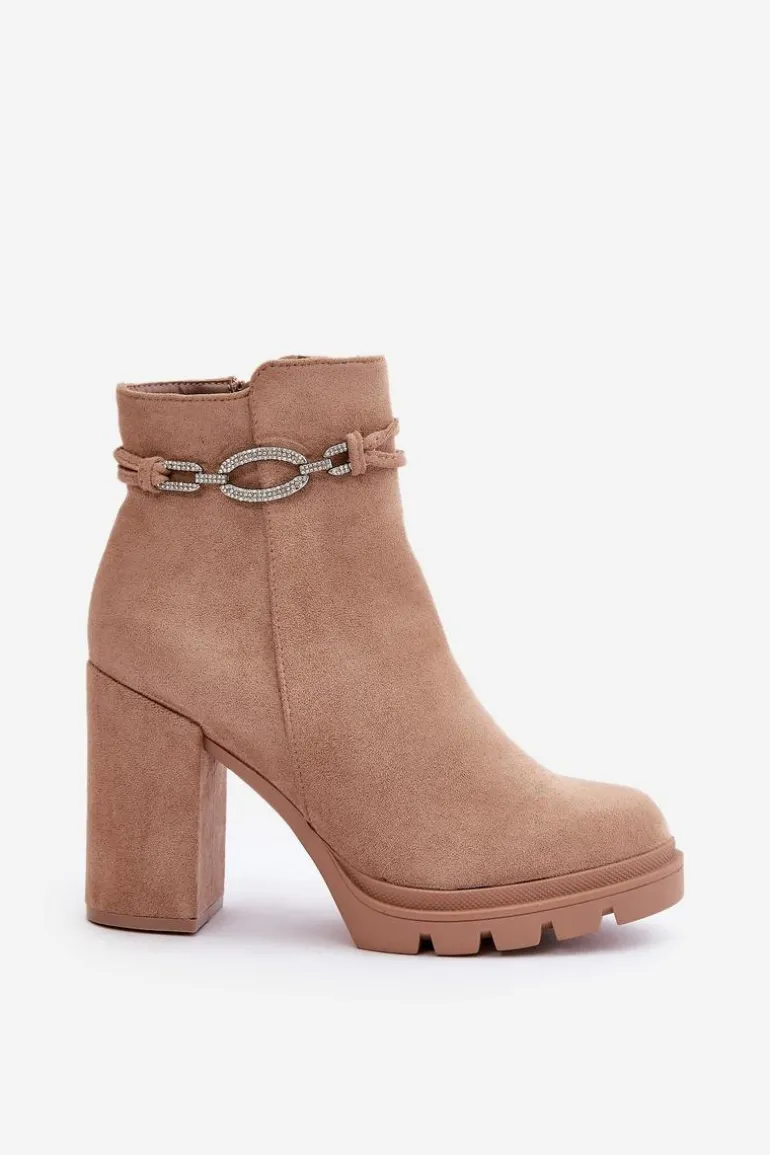 Botki z eko zamszu na wysokim obcasie typu słupek. Zapinane na zamek, co ułatwia zakładanie i zdejmowanie obuwia. Wnętrze ocieplone jest kocem obuwniczym, co gwarantuje komfort w zimniejsze dni. Cholewka ozdobiona jest eleganckim paskiem, który dodaje im stylu i charakteru. Noski zaokrąglone. Przy wyborze rozmiaru prosimy sugerować się tabelą rozmiarów.