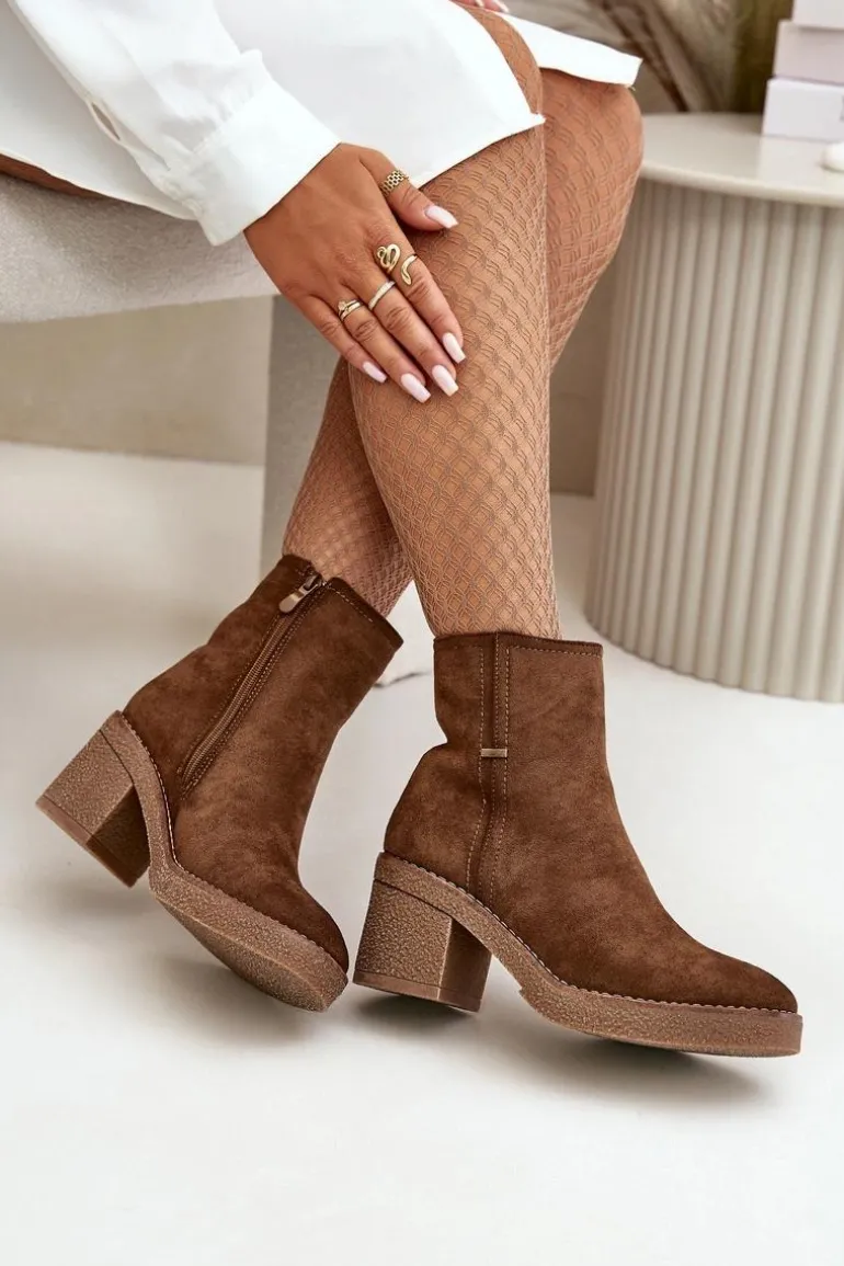 Damskie botki z eko zamszu, który jest miękki i przyjemny w dotyku. Osadzone na stabilnym obcasie w formie słupka, co zapewnia wygodę i pewność chodzenia przez cały dzień, jednocześnie dodając kilka centymetrów wzrostu i podkreślając sylwetkę. Wnętrze ocieplone jest kocem obuwniczym, który zapewnia ciepło i komfort w chłodniejsze dni, chroniąc stopy przed zimnem. Dzięki zapięciu na zamek, ich zakładanie i zdejmowanie jest szybkie i bezproblemowe, co jest dużym atutem w codziennym użytkowaniu. Przy wyborze rozmiaru prosimy sugerować się tabelą rozmiarów.