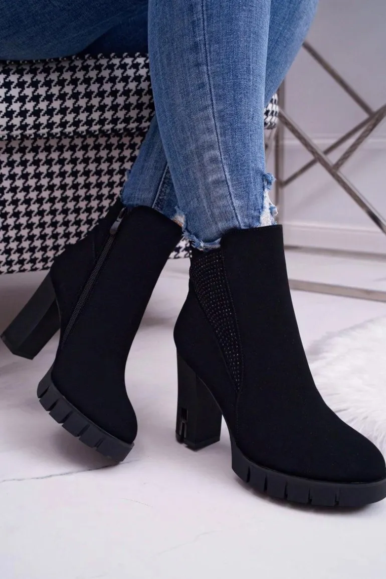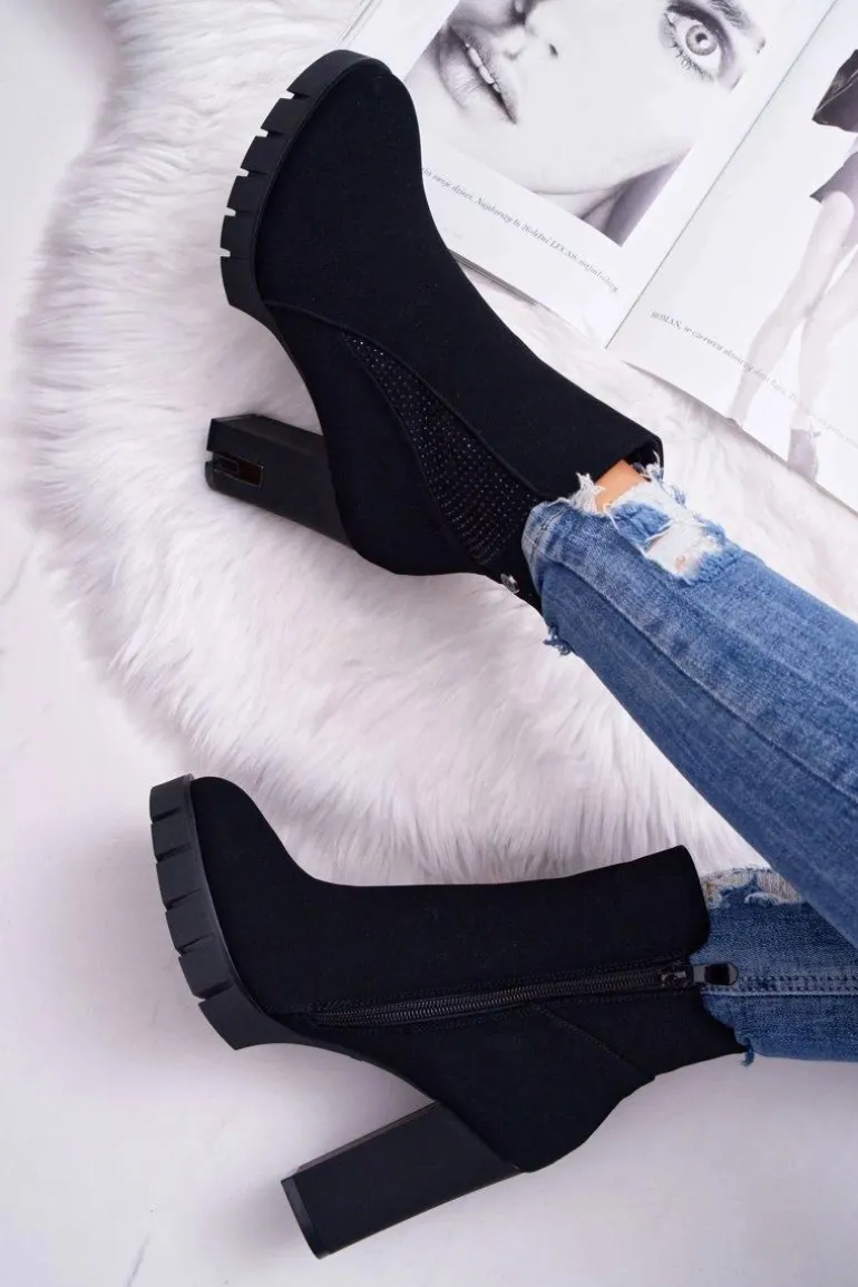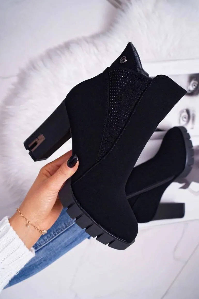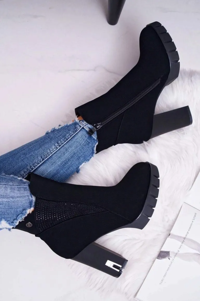 Botki Damskie na Słupku Platformie Z Cyrkoniami Czarne Deren