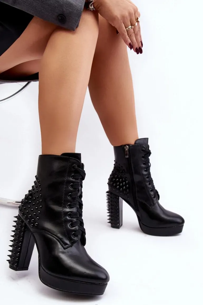Botki damskie wykonane ze skóry ekologicznej. Cholewka oraz obcas są ozdobione ćwiekami, które dodają im wyjątkowego charakteru. Obcas w formie wysokiego słupka i platforma nadają modny i stylowy wygląd. Nie czekaj, aż znikną. Zrób wrażenie nie tylko na sobie, ale również na innych! Przy wyborze rozmiaru prosimy kierować się tabelą rozmiarów