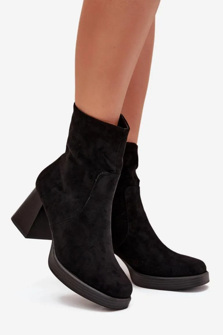 Botki damskie z eko zamszu na słupkowym obcasie to elegancki wybór na chłodniejsze dni. Cholewka sięga za kostkę. Zapinane na zamek, co zapewnia szybkie zakładanie i zdejmowanie obuwia. Noski delikatnie zaokrąglone. Stylowy fason sprawia, że te botki doskonale komponują się zarówno z sukienkami, jak i spódnicami, tworząc eleganckie i kobiece stylizacje. Przy wyborze rozmiaru prosimy sugerować się tabelą rozmiarów.