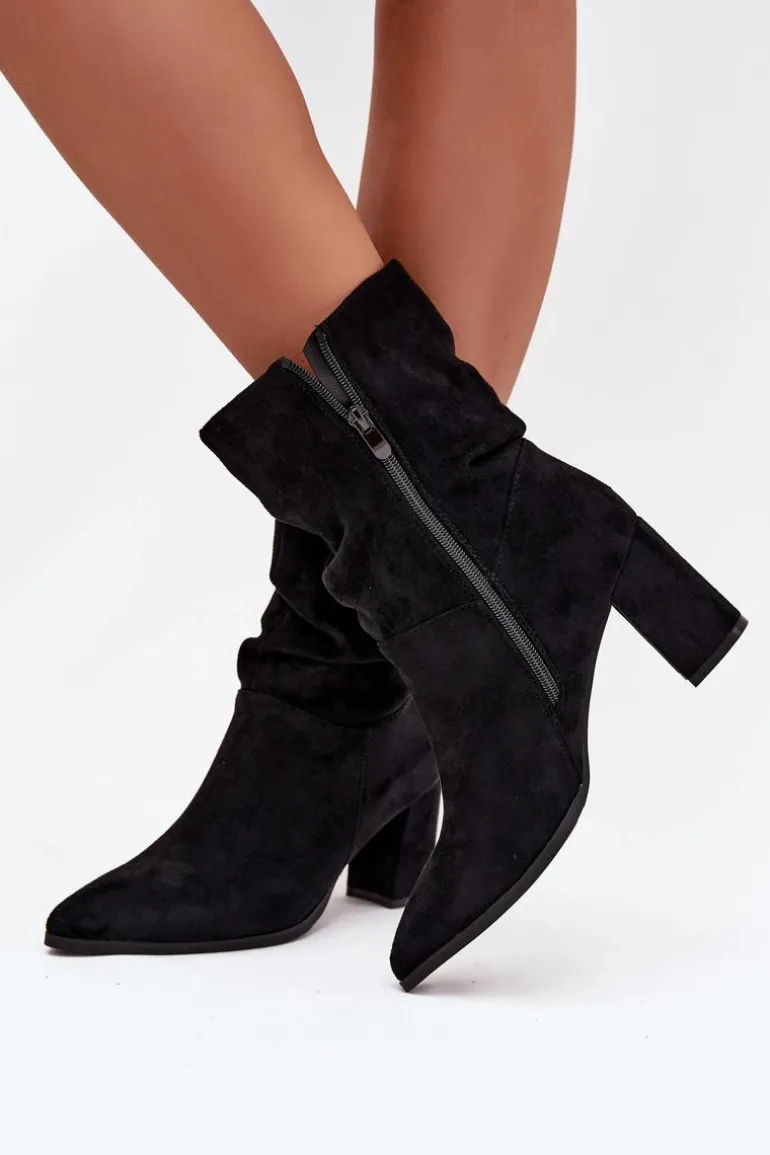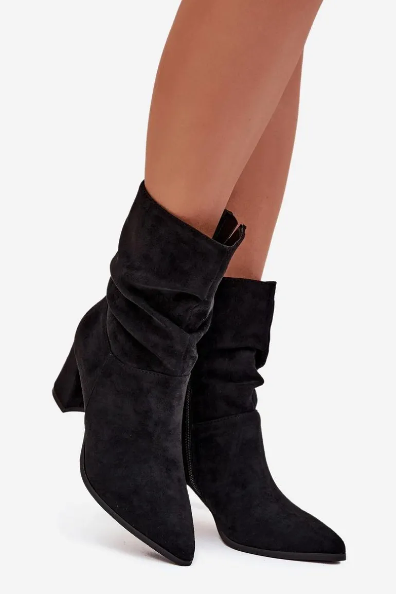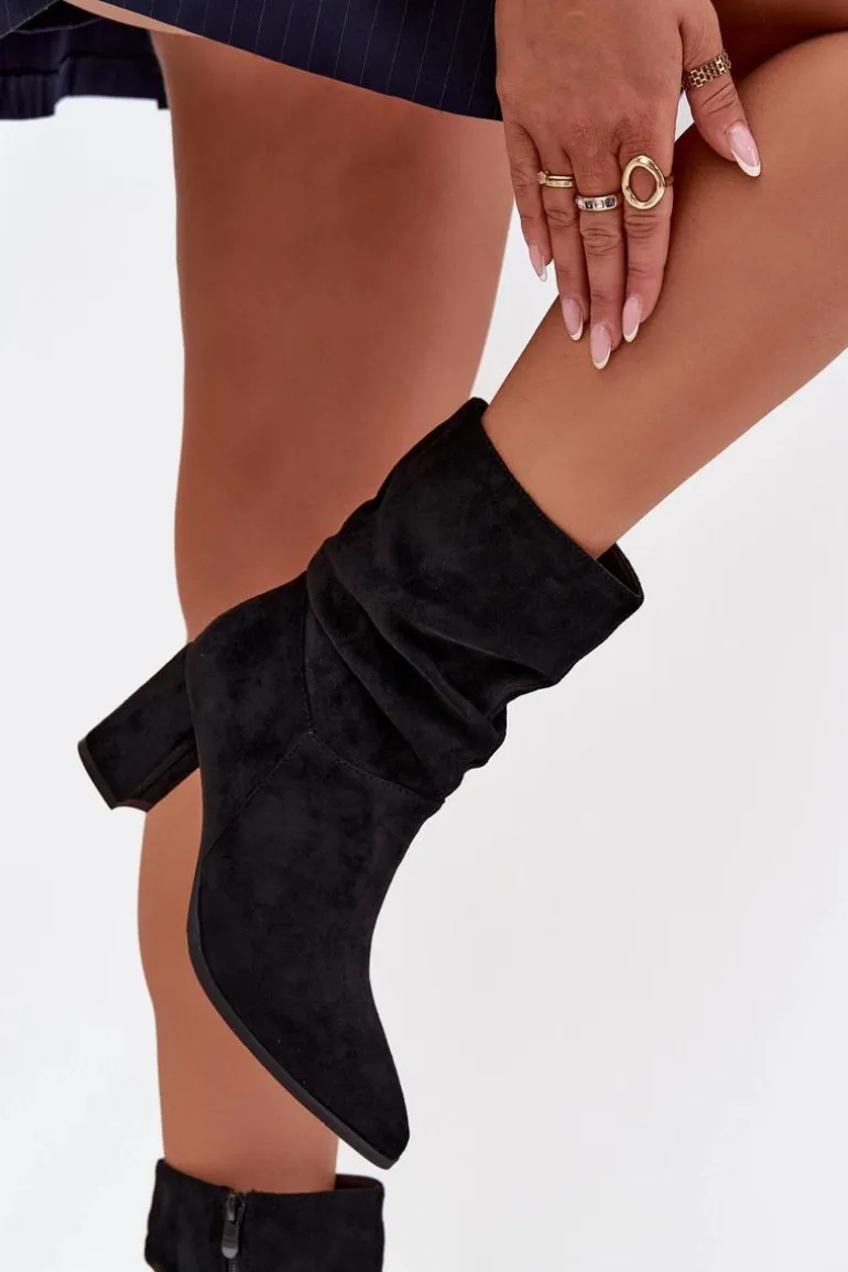 Botki damskie wykonane z eko zamszu to elegancka i modna propozycja na sezon jesienno-zimowy. Osadzone na stabilnym obcasie typu słupek pięknie wysmuklają sylwetkę, a szpiczaste noski dodają całości kobiecego charakteru. Marszczona cholewka nadaje stylowego, nowoczesnego wyglądu, a praktyczny zamek ułatwia zakładanie. Wnętrze ocieplone kocem obuwniczym zapewnia komfort i ciepło w chłodniejsze dni. To model, który doskonale sprawdzi się zarówno w codziennych, jak i eleganckich stylizacjach. Przy wyborze rozmiaru prosimy sugerować się tabelą rozmiarów.