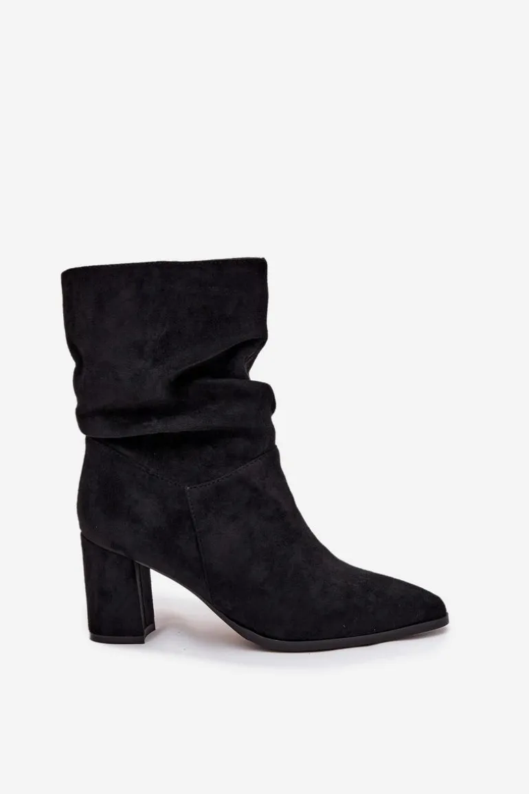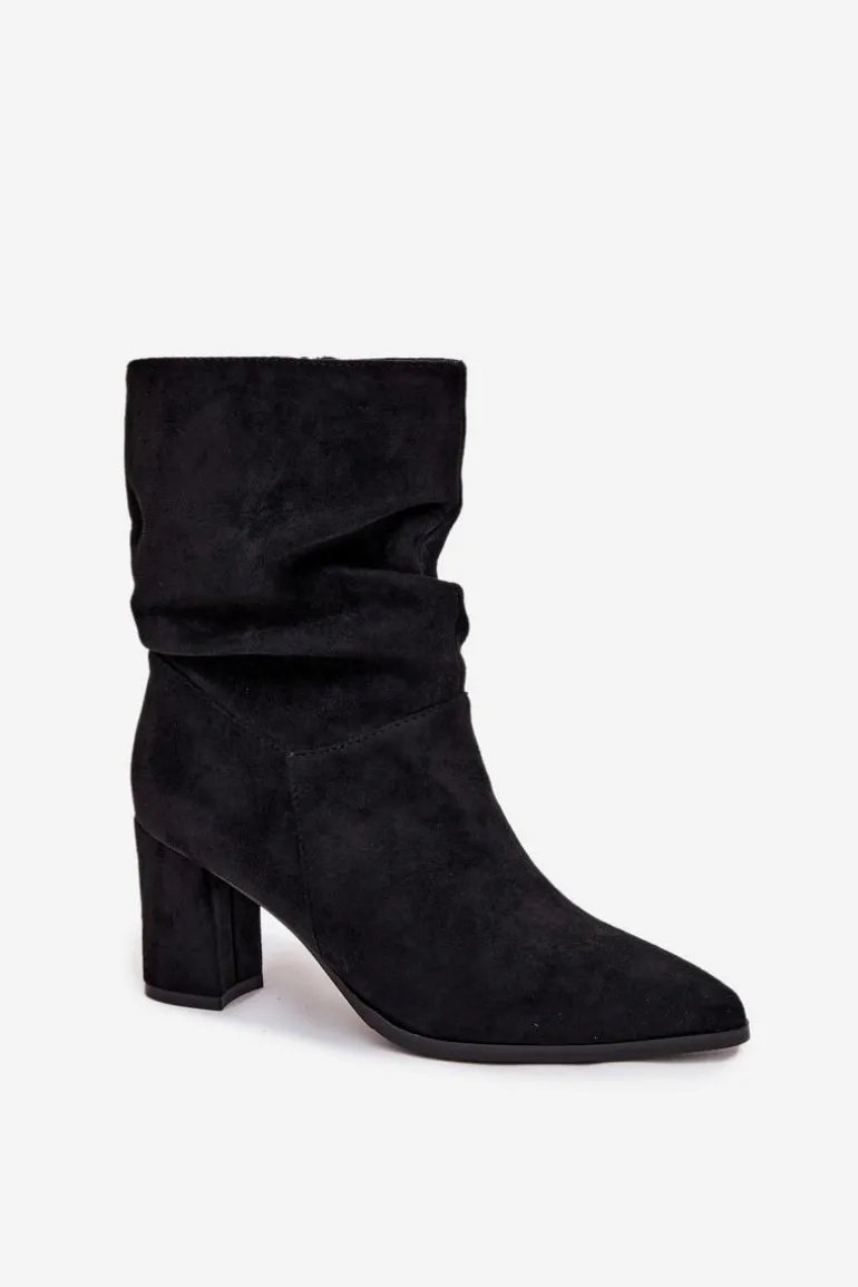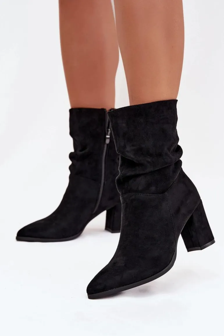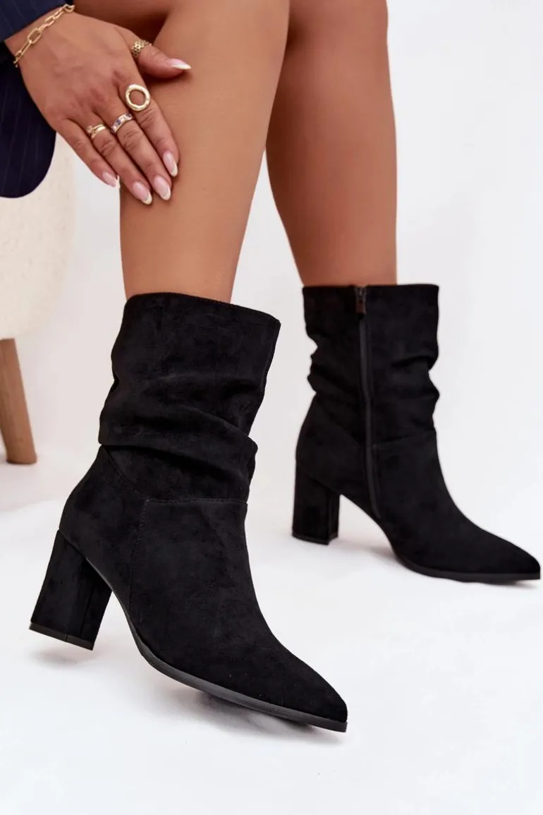 Botki damskie wykonane z eko zamszu to elegancka i modna propozycja na sezon jesienno-zimowy. Osadzone na stabilnym obcasie typu słupek pięknie wysmuklają sylwetkę, a szpiczaste noski dodają całości kobiecego charakteru. Marszczona cholewka nadaje stylowego, nowoczesnego wyglądu, a praktyczny zamek ułatwia zakładanie. Wnętrze ocieplone kocem obuwniczym zapewnia komfort i ciepło w chłodniejsze dni. To model, który doskonale sprawdzi się zarówno w codziennych, jak i eleganckich stylizacjach. Przy wyborze rozmiaru prosimy sugerować się tabelą rozmiarów.