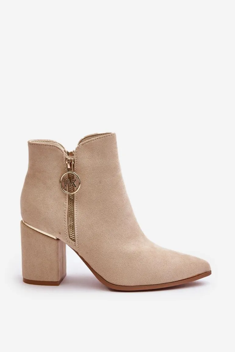 Eleganckie botki z eko zamszu, osadzone na obcasie typu słupek. Wyróżniają się spiczastymi noskami, które nadają im szyku. Wnętrze jest ocieplone, zapewniając komfort w chłodniejsze dni. Zapinane na zamek z boku, dodatkowo ozdobione złotym zamkiem, co dodaje wyjątkowego stylu. Przy wyborze rozmiaru prosimy sugerować się tabelą rozmiarów.