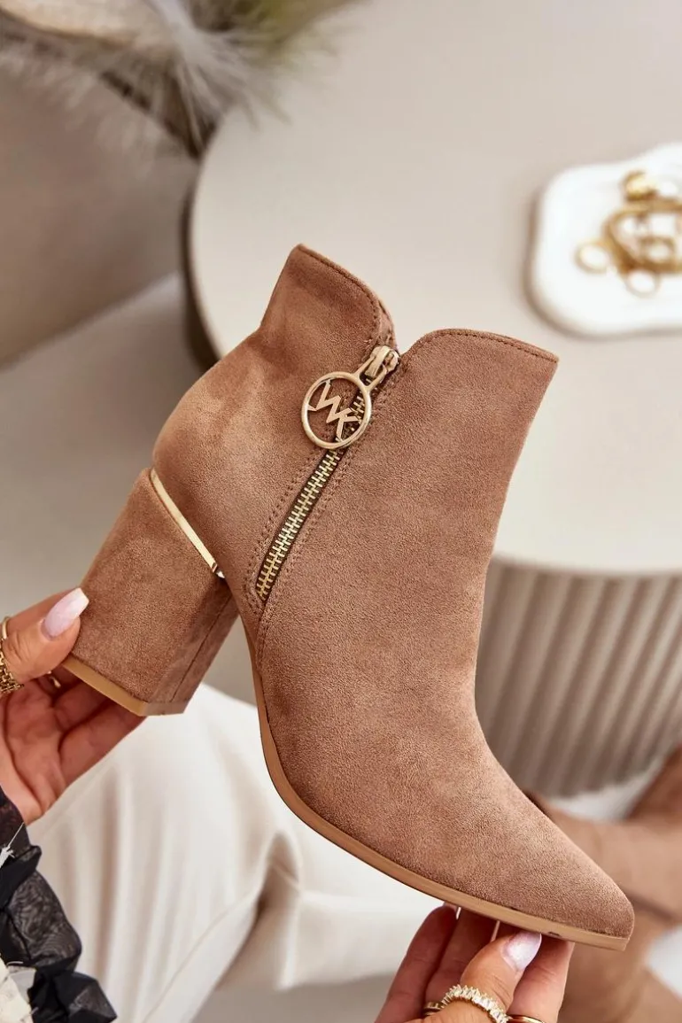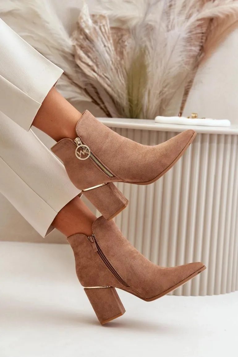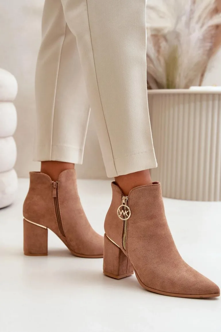 Botki Damskie Na Słupku Z Noskami W Szpic Eko Zamszowe Ocieplane Brązowe Raisha
