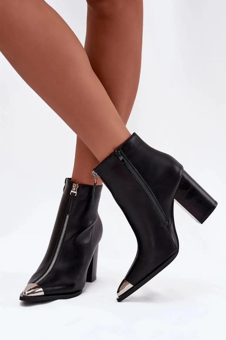 Botki damskie z eko skóry to stylowa propozycja na co dzień i do bardziej wyjściowych stylizacji. Model osadzony na stabilnym słupku zapewnia komfortowy krok, a zamek po boku ułatwia szybkie zakładanie i dopasowanie do stopy. Dodatkowy ozdobny zamek z przodu oraz subtelny metalowy detal nadają nowoczesnego charakteru. Przy wyborze rozmiaru prosimy sugerować się tabelą rozmiarów.