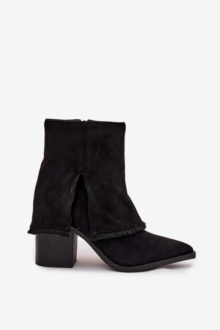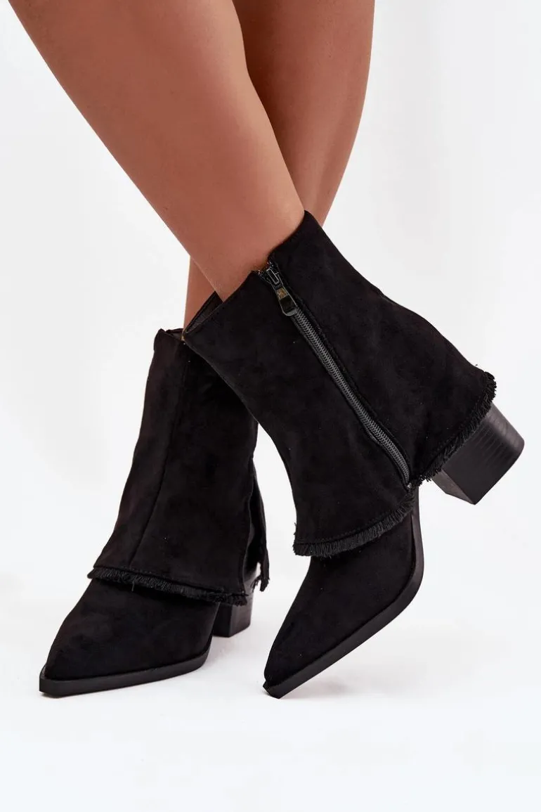 Botki damskie wykonane z eko zamszu. Model osadzony został na stabilnym obcasie typu słupek, który pięknie wysmukla sylwetkę i dodaje kilku centymetrów wzrostu, zachowując przy tym komfort noszenia. Charakterystycznym elementem jest wywinięta cholewka nachodząca na obcas, co nadaje wyjątkowego wyglądu i sprawia, że wyróżniają się na tle klasycznych fasonów. Szpiczaste noski dodatkowo podkreślają smukłą linię obuwia. Praktyczne zapięcie na zamek ułatwia zakładanie i zdejmowanie. To botki idealne dla kobiet, które szukają stylowego uzupełnienia jesienno-zimowych stylizacji – zarówno tych codziennych, jak i bardziej wyjściowych. Przy wyborze rozmiaru prosimy sugerować się tabelą rozmiarów.