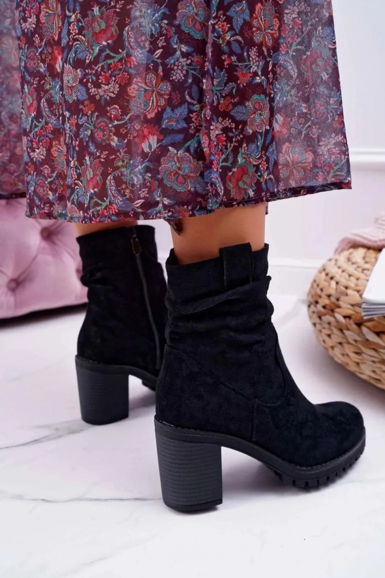 Botki na słupku wykonane z eko-zamszu. Stworzymy z nimi wiele wspaniałych stylizacji! Wnętrze pokryte kocem obuwniczym z krótkim włosiem, co zapewni nam komfort w każdych warunkach. Suwak po wewnętrznej stronie ułatwi nam zakładanie. Przy wyborze rozmiaru prosimy sugerować się tabelą rozmiarów