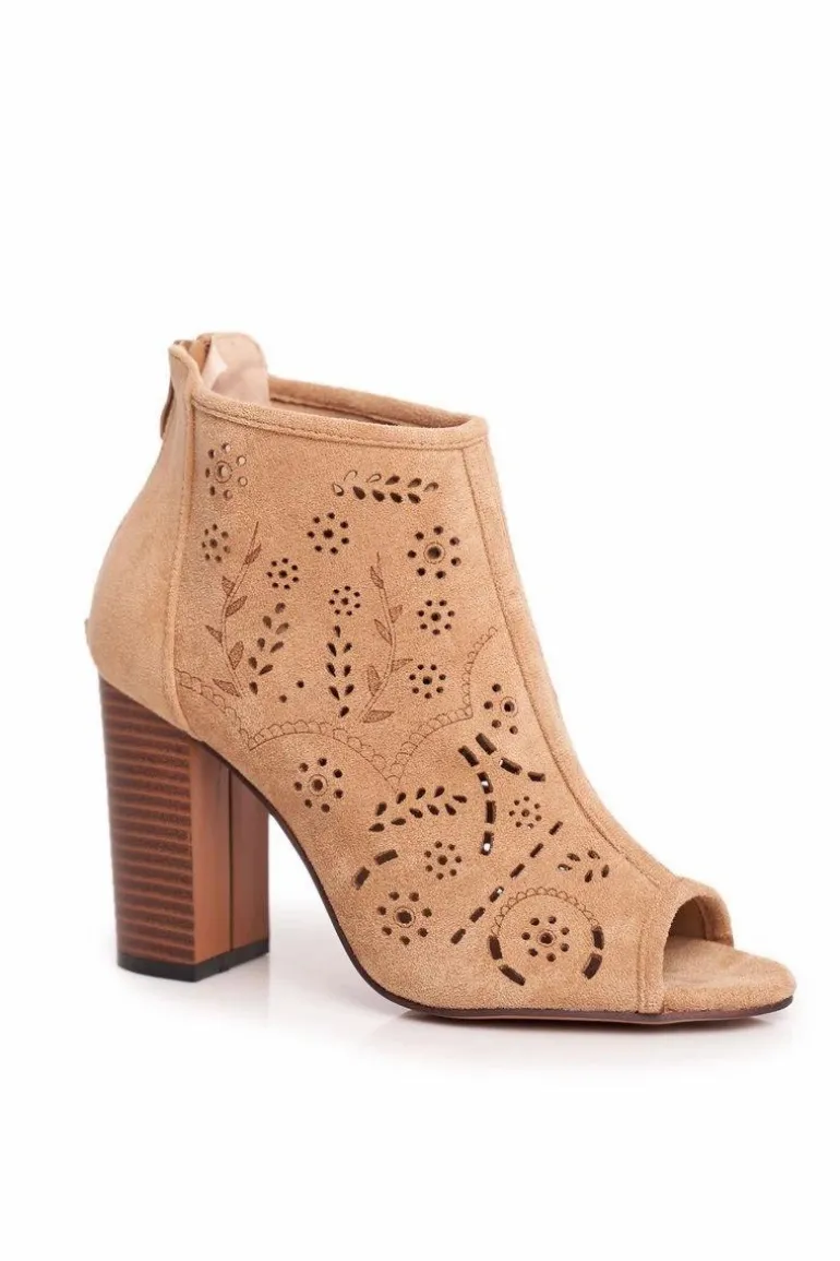 Botki Damskie Na Słupku Zamszowe Ażurowe Beżowe Papillon