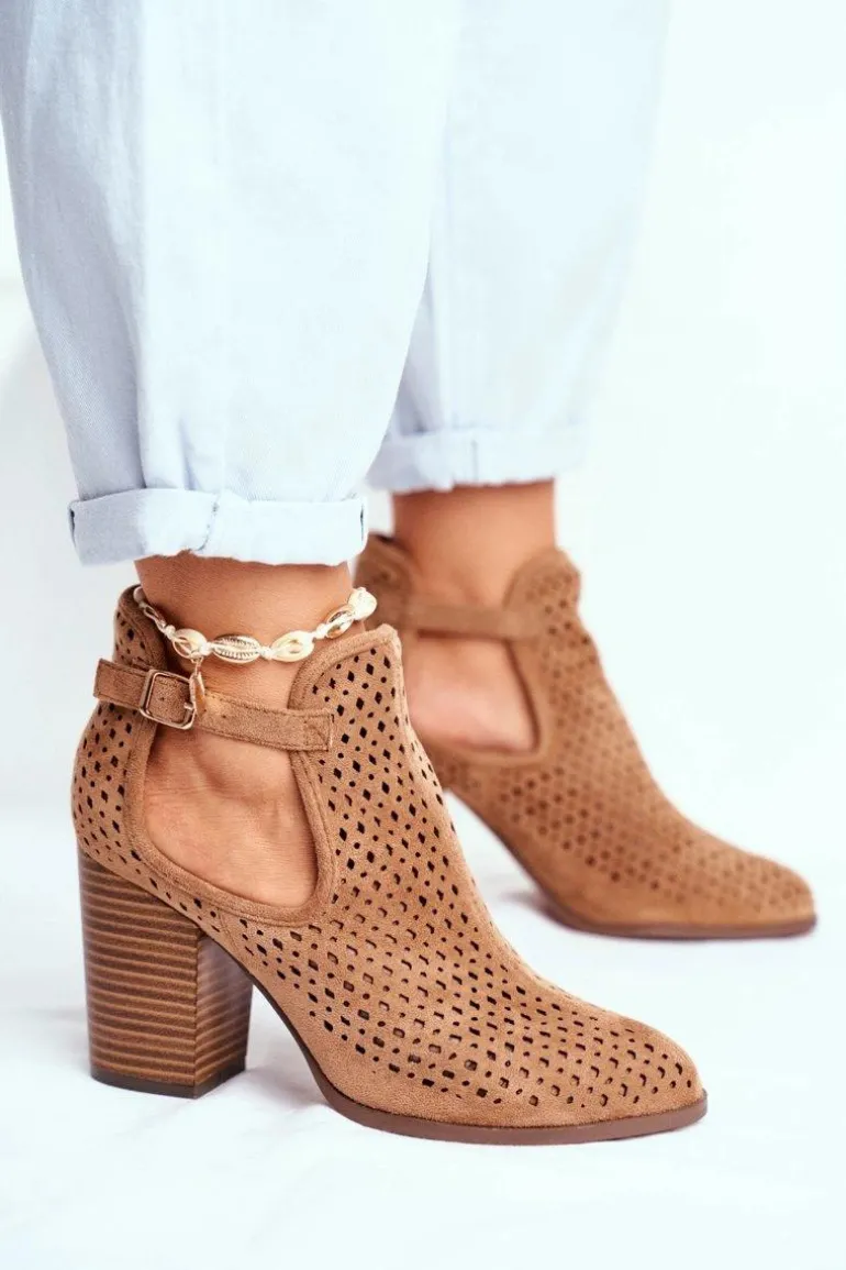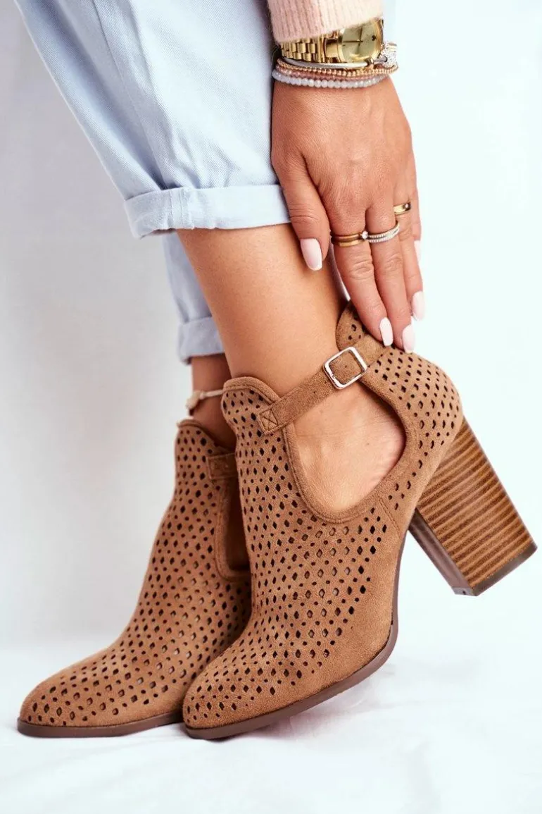 Botki Damskie Na Słupku Zamszowe Ażurowe Camel Morrena