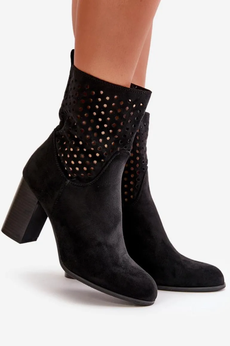 Botki damskie z ażurową cholewką. Wykonane z eko zamszu. Zapinane na zamek, co ułatwia zakładanie i zdejmowanie, oraz zapewnia dobre dopasowanie do stopy. Botki osadzone są na stabilnym obcasie typu słupek, który podkreśla kobiecy wygląd, dodaje kilku centymetrów wzrostu i zapewnia wygodę noszenia. Te stylowe botki świetnie komponują się z różnorodnymi stylizacjami, od casualowych po bardziej eleganckie, będąc doskonałym wyborem na każdą okazję. Przy wyborze rozmiaru prosimy sugerować się tabelą rozmiarów.