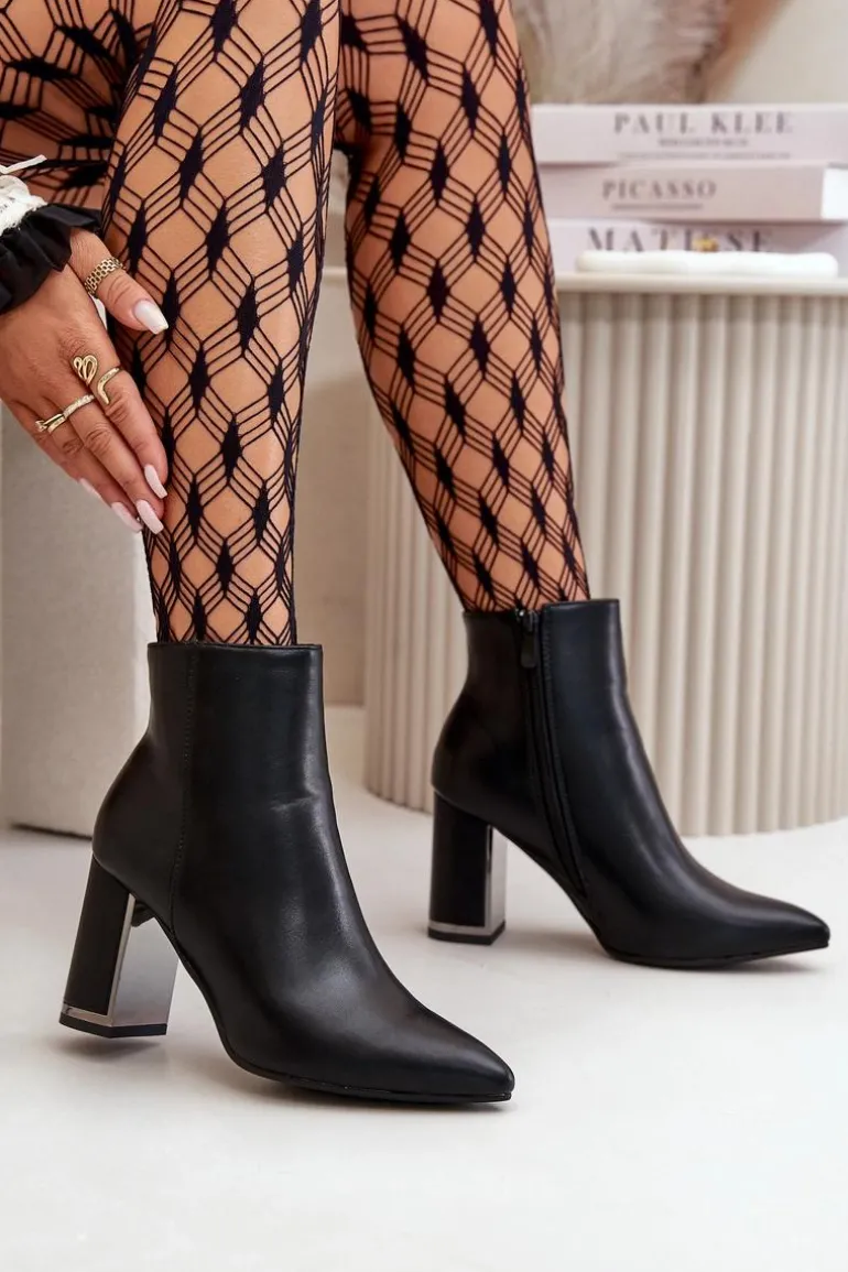 Damskie botki wykonane z eko skóry. Wnętrze jest ocieplane, co zapewnia ciepło i komfort w chłodniejsze dni. Noski w szpic nadają im stylowego charakteru, a obcas w formie stabilnego słupka jest dodatkowo ozdobiony lustrzanym elementem, co dodaje botkom wyjątkowego blasku i modnego akcentu. Koniecznie powinnaś je mieć w swojej jesienno-zimowej garderobie! Przy wyborze rozmiaru prosimy sugerować się tabelą rozmiarów.
