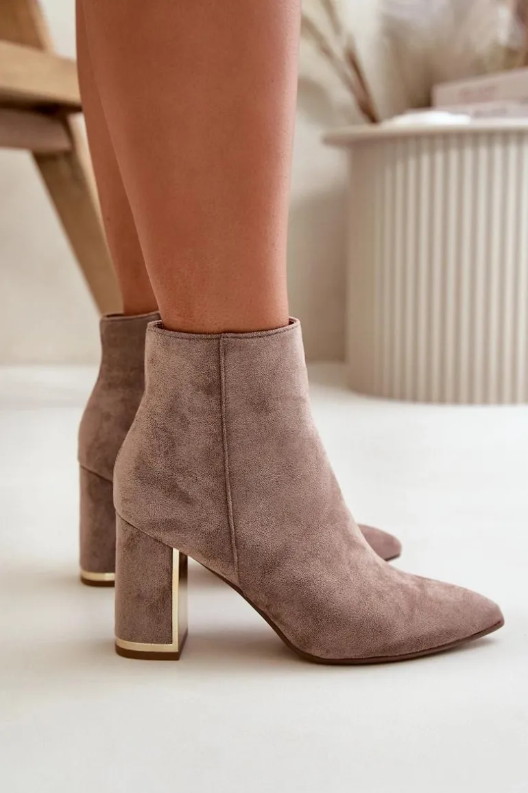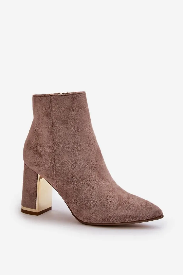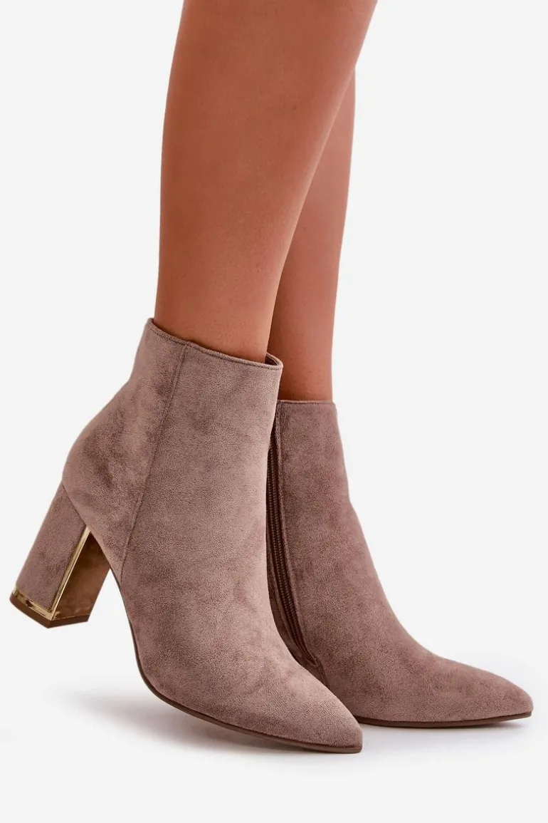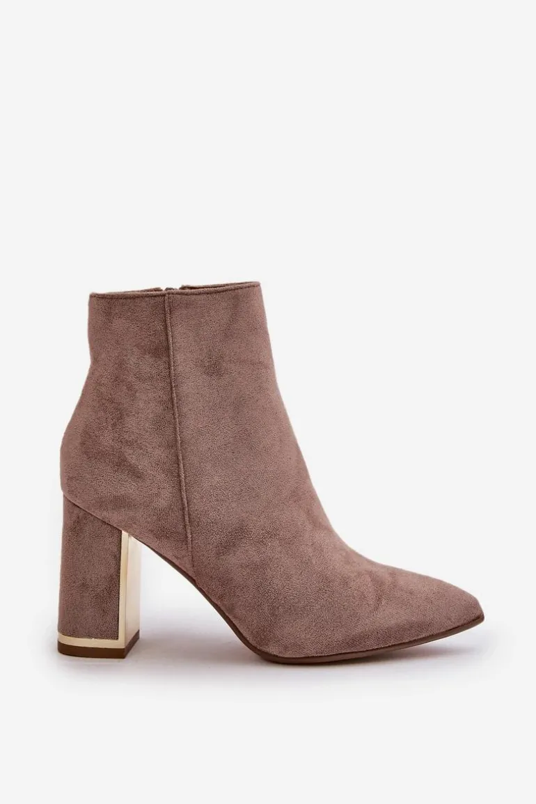 Damskie botki wykonane z eko zamszu, który jest przyjemny w dotyku i dodaje im eleganckiego wyglądu. Wnętrze botków jest ocieplane, co zapewnia ciepło i komfort w chłodniejsze dni. Noski w szpic nadają im stylowego charakteru, a obcas w formie stabilnego słupka jest dodatkowo ozdobiony lustrzanym elementem, co dodaje botkom wyjątkowego blasku i modnego akcentu. Koniecznie powinnaś je mieć w swojej jesienno-zimowej garderobie! Przy wyborze rozmiaru prosimy sugerować się tabelą rozmiarów.
