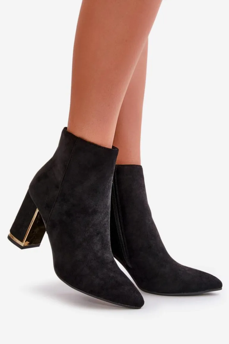 Damskie botki wykonane z eko zamszu, który jest przyjemny w dotyku i dodaje im eleganckiego wyglądu. Wnętrze botków jest ocieplane, co zapewnia ciepło i komfort w chłodniejsze dni. Noski w szpic nadają im stylowego charakteru, a obcas w formie stabilnego słupka jest dodatkowo ozdobiony lustrzanym elementem, co dodaje botkom wyjątkowego blasku i modnego akcentu. Koniecznie powinnaś je mieć w swojej jesienno-zimowej garderobie! Przy wyborze rozmiaru prosimy sugerować się tabelą rozmiarów.