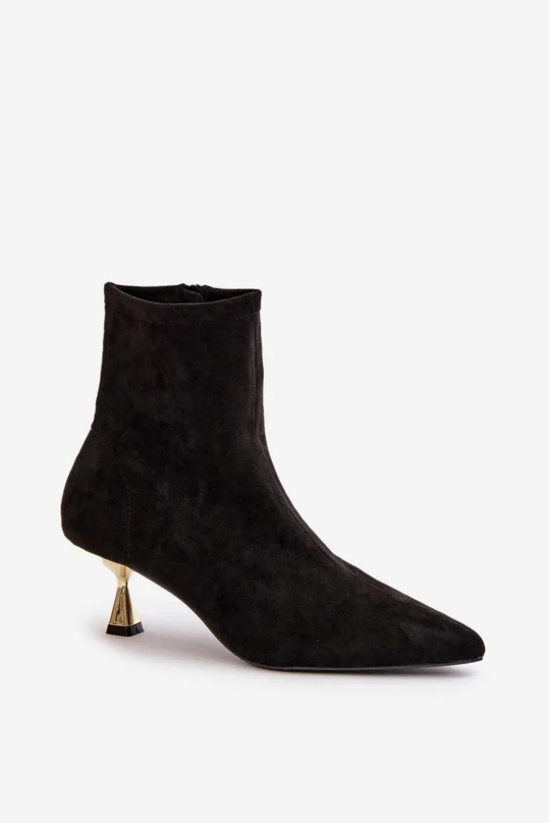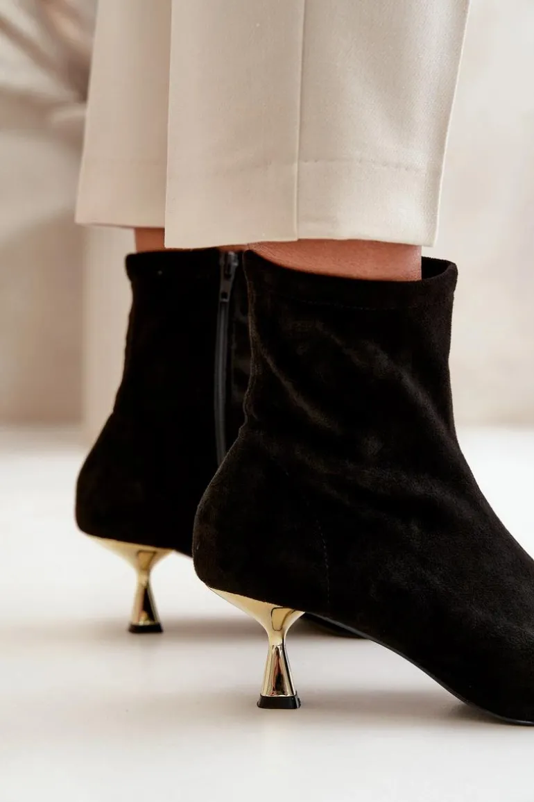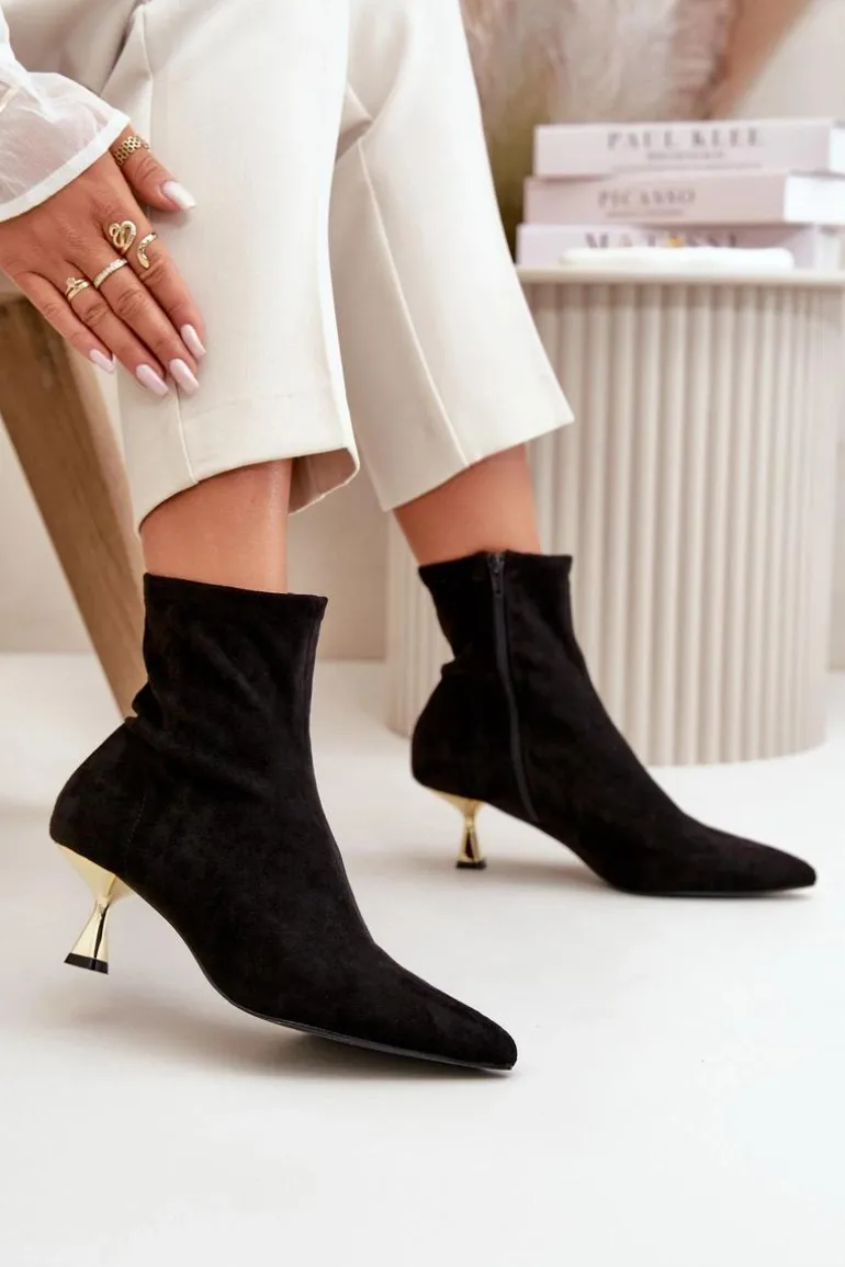 Stylowe botki damskie na ozdobnej szpilce to elegancki dodatek, który z pewnością przyciągnie spojrzenia. Wykonane z eko zamszu. Zapinane na zamek, który zapewnia wygodę i łatwość zakładania. Noski w szpic dodają wyrafinowanego charakteru, podkreślając kobiecość i smukłość sylwetki. Idealne na specjalne okazje, jak i do codziennych stylizacji, kiedy chcesz dodać sobie odrobinę elegancji. Przy wyborze rozmiaru prosimy sugerować się tabelą rozmiarów.
